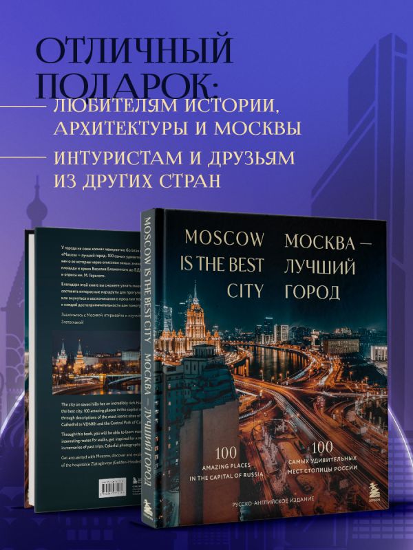 У города на семи холмах невероятно богатая история. Двуязычное подарочное издание «Москва — лучший город. 100 самых удивительных мест столицы России» расскажет вам о ее истории через описание самых знаковых объектов города — от Красной площади и храма Василия Блаженного до ВДНХ и Центрального парка культуры и отдыха им. М. Горького.