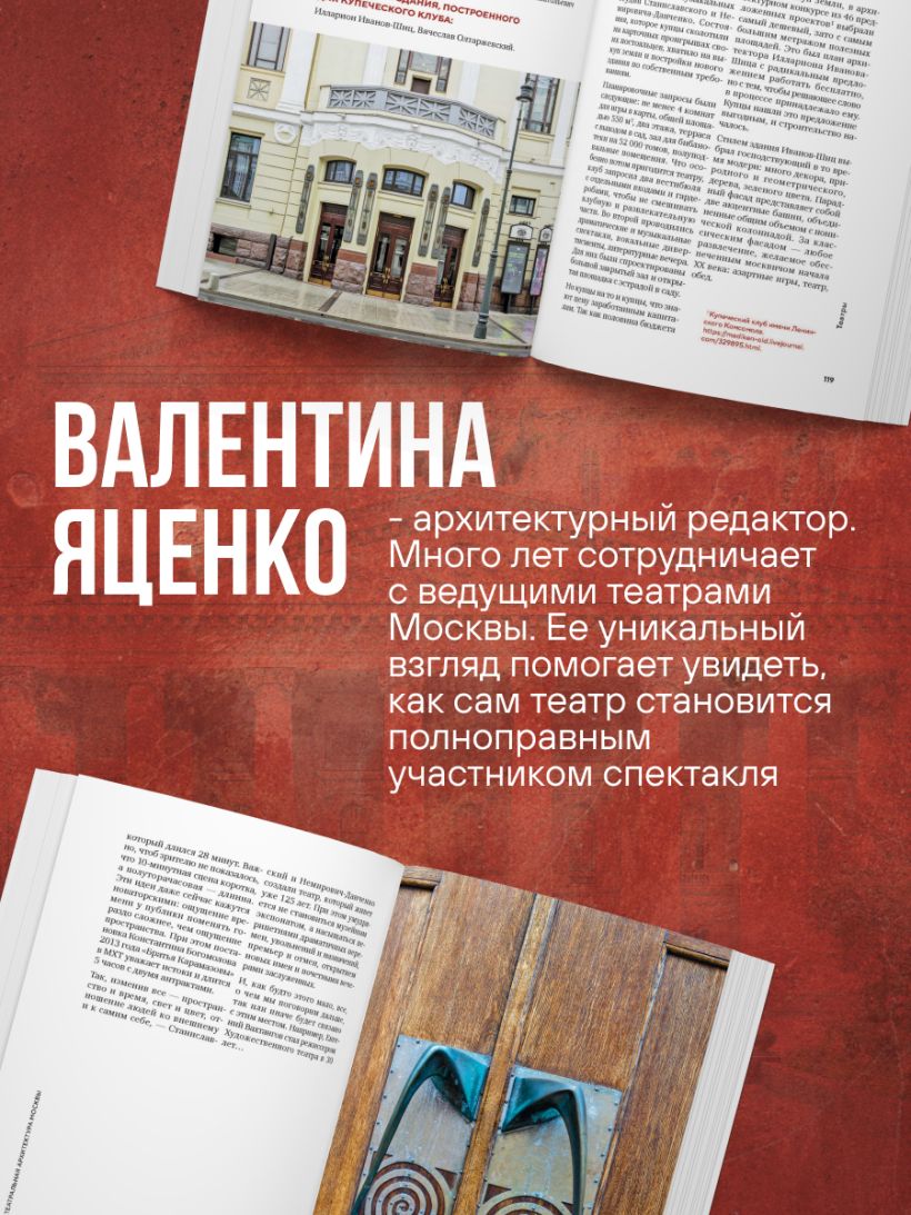 Эта книга — о театрах и о Москве, о том, как самый социальный вид искусства живет на столичных сценах. Валентина Яценко, редактор, долгое время сотрудничающая с театрами Москвы, рассказывает о том, как здание театра с его фасадами, колоннами, фальш-окнами, ложами, лепниной или аскетичной кирпичной кладкой, не просто служит фоном для игры актеров, но вступает в активный диалог с каждым, кто переступает его порог. Именно так само пространство театра становится частью взаимодействия со зрителем.