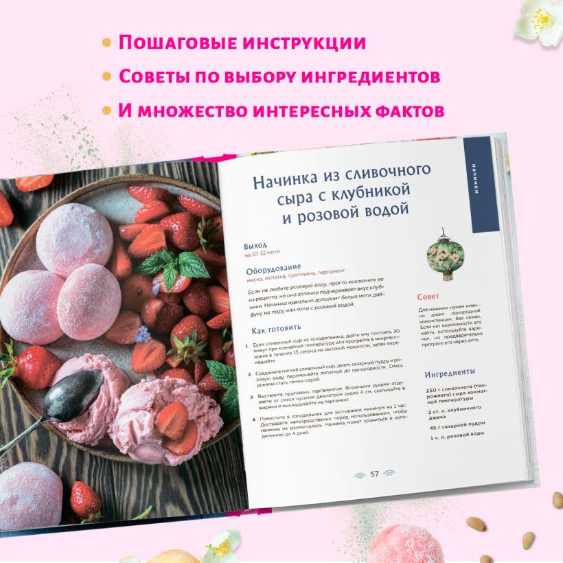 Приготовить трендовый японский десерт моти? Проще простого с книгой «Моти. Легендарный воздушный десерт из Японии. Более 50 базовых рецептов, начинок и дизайнов»!