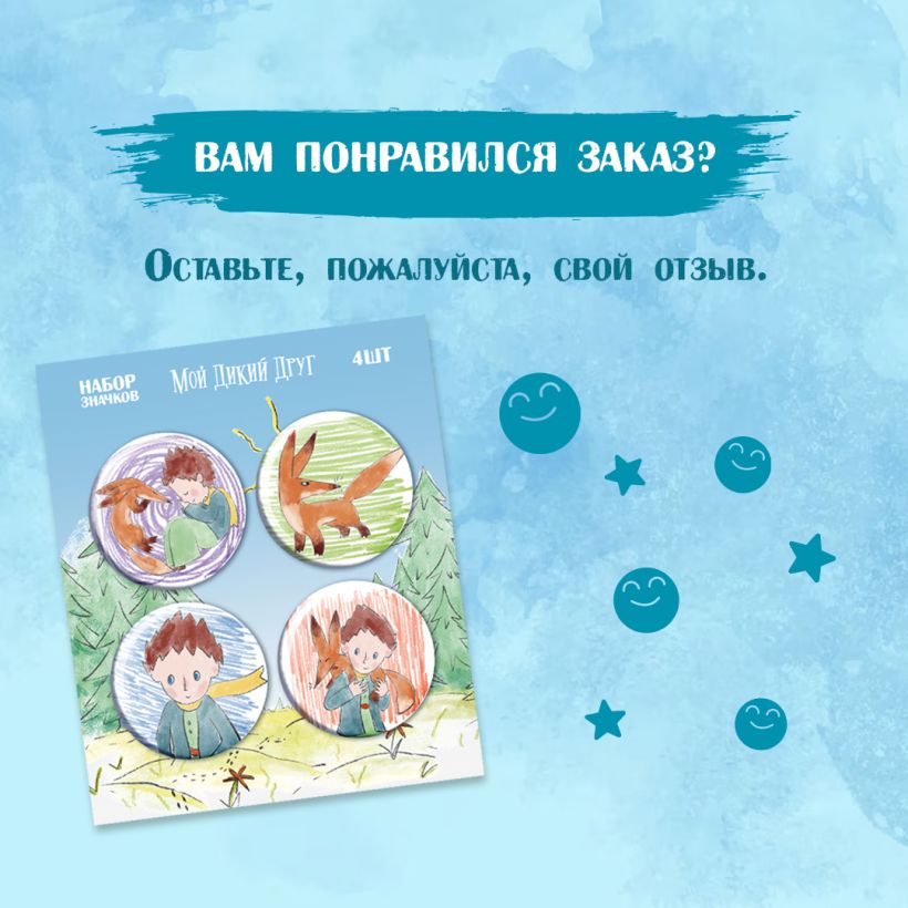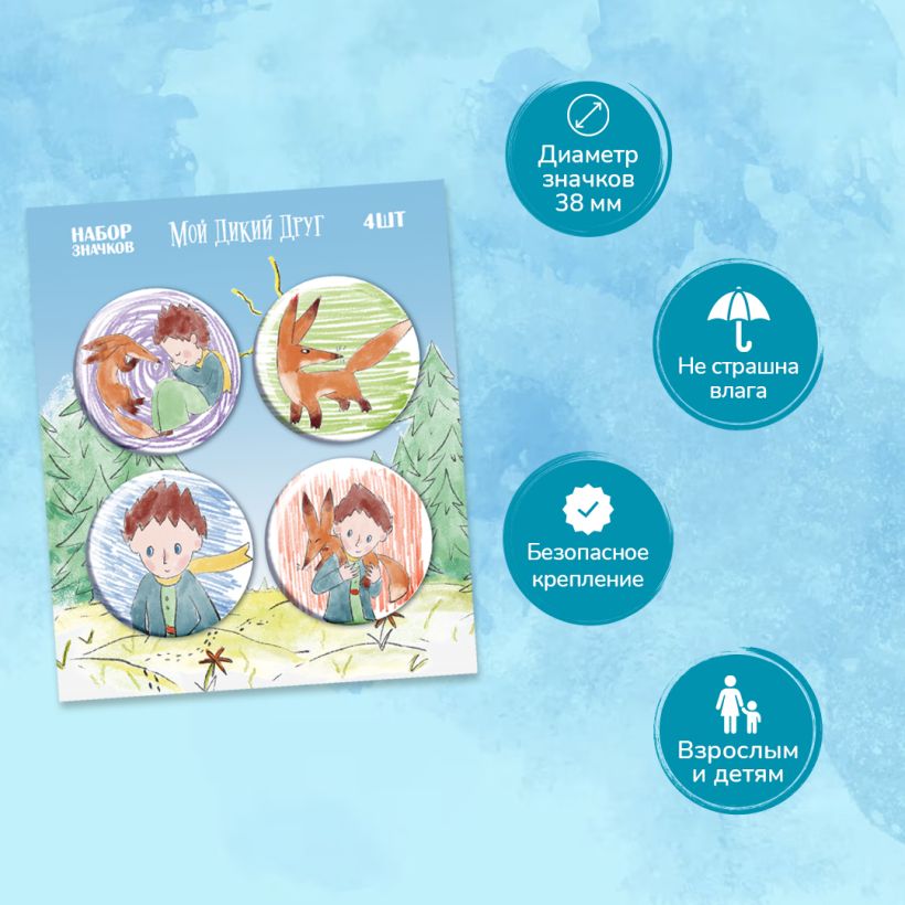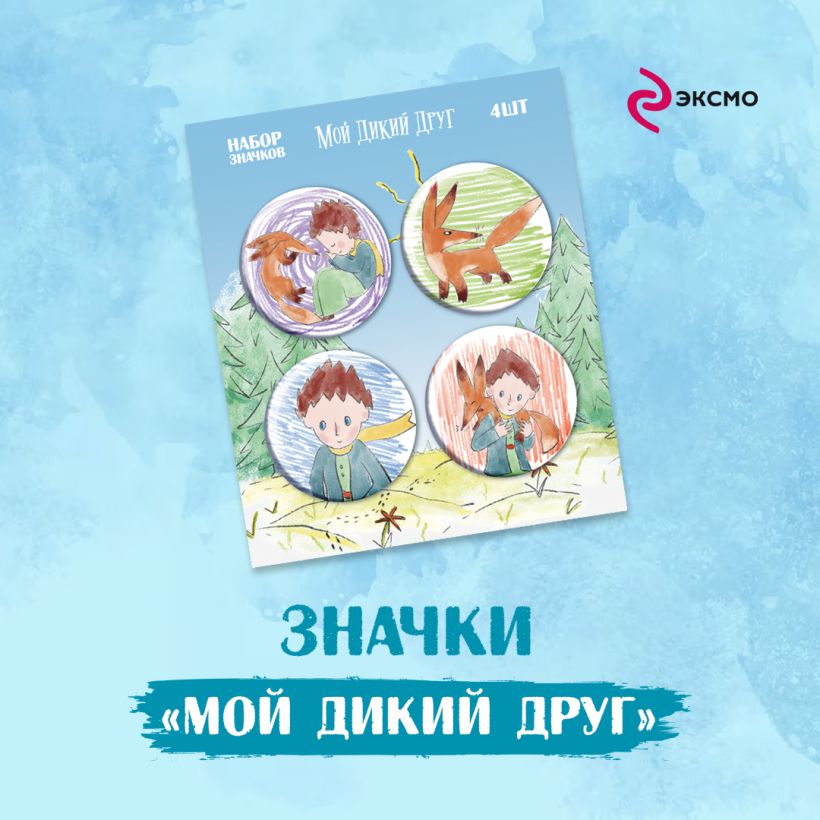 Набор значков сделан совместно с «Яндекс студией» («Кинопоиск») к выходу фильма «Мой дикий друг». Это трогательная история о мальчике, спасающем лисенка от браконьеров. Главный герой читает своему новому другу притчу «Маленький принц» и погружается с головой в сказочный мир Экзюпери. В главных ролях Юлия Александрова, Юрий Колокольников, Михаил Башкатов, Евгений Шварц и другие.