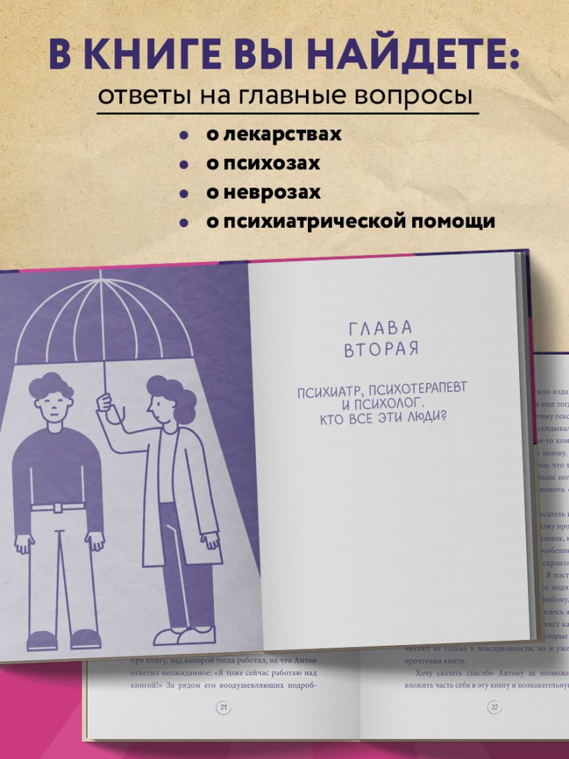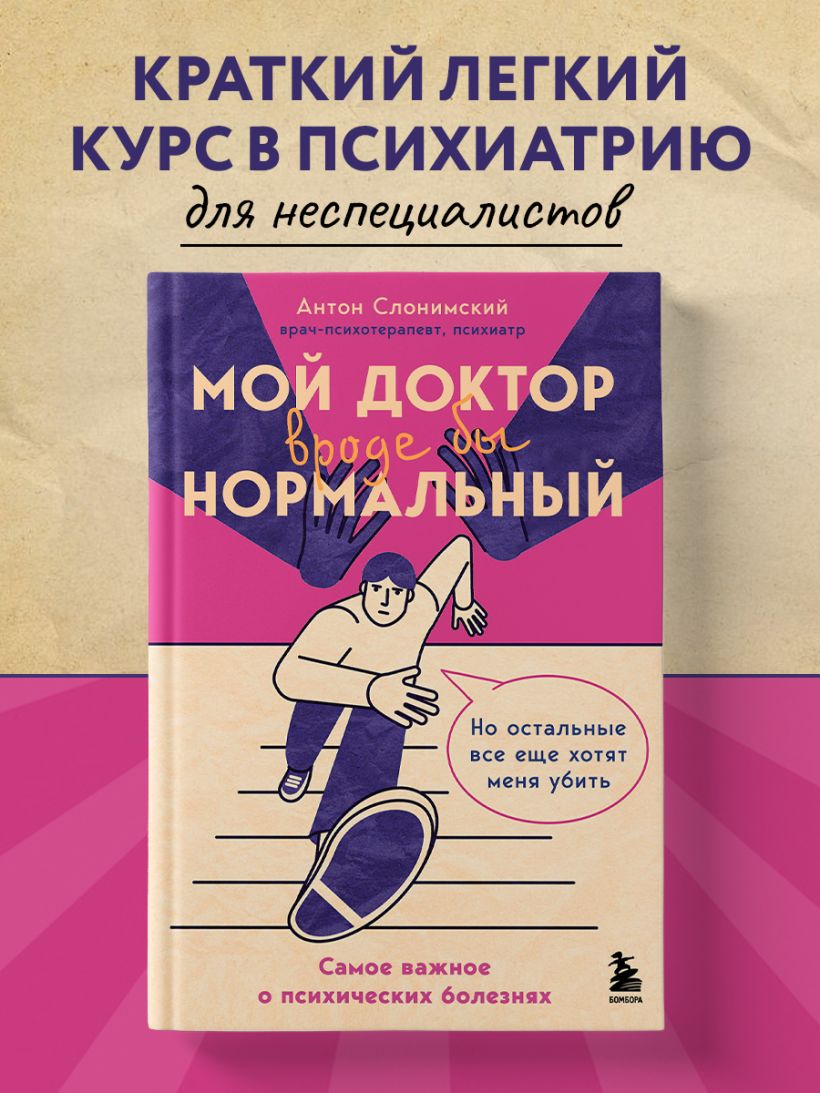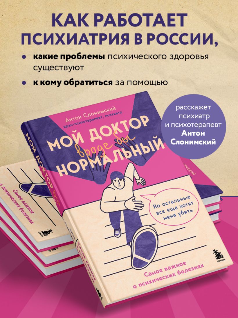 Депрессия, панические атаки, тревожное расстройство, бессонница и даже шизофрения. Существует огромный список заболеваний и их проявлений, с которыми люди обращаются к специалистам в надежде найти лечение и улучшить свое физическое и ментальное состояние. Но несмотря на распространенность проблем с психическим здоровьем, стереотипы о диагностике и лечении существуют до сих пор. Именно поэтому Антон Слонимский, психиатр и психотерапевт, собирает всю самую важную информацию воедино и представляет ее в своей книге. Максимально коротко и полезно. Он дает ценные советы по выбору врача, а также рассказывает, как самостоятельно справиться с тревогой, улучшить сон и наладить свой образ жизни. Вы узнаете, как работает психиатрия в России, и перестанете бояться похода к врачу. «Мой доктор вроде бы нормальный» — аптечка первой помощи при проблемах с психическим здоровьем, которая обязательно должна быть у каждого под рукой.