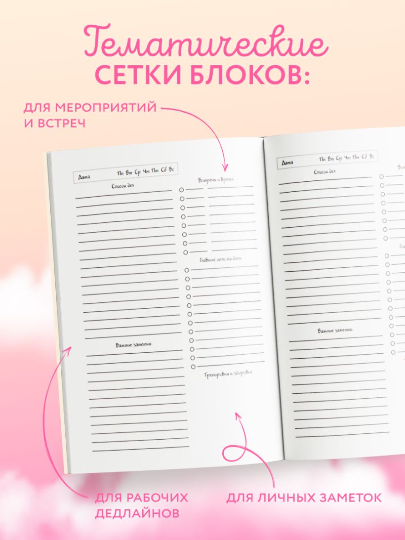 - Сетка блока создана с учетом современных тенденций европейского дизайна: часть распределена по времени — для ваших рабочих дедлайнов, а другая часть — линейки, которые можно использовать как для личных заметок, так и для планирования рабочих задач.
