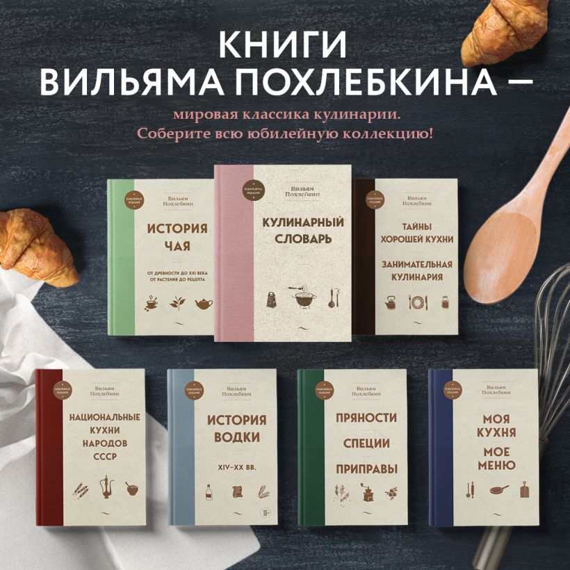 Кулинарные книги В.В. Похлебкина покупают вот уже более полувека. Тираж за все эти годы превысил 1 млн экземпляров. Спрос на его труды велик и с годами не уменьшается. В советское время кулинарных книг практически не было. В наше время при всем изобилии авторов, российских и иностранных, форматов, и объемных, и небольших, черно-белых и цветных, любых тем, касающихся еды, — книги Вильяма Похлебкина пользуются доверием, внушают уверенность в положительном результате приготовления, служат для многих учебным пособием по искусству кулинарии. Мы начинаем новую серию, приуроченную к 100-летию со дня рождения.