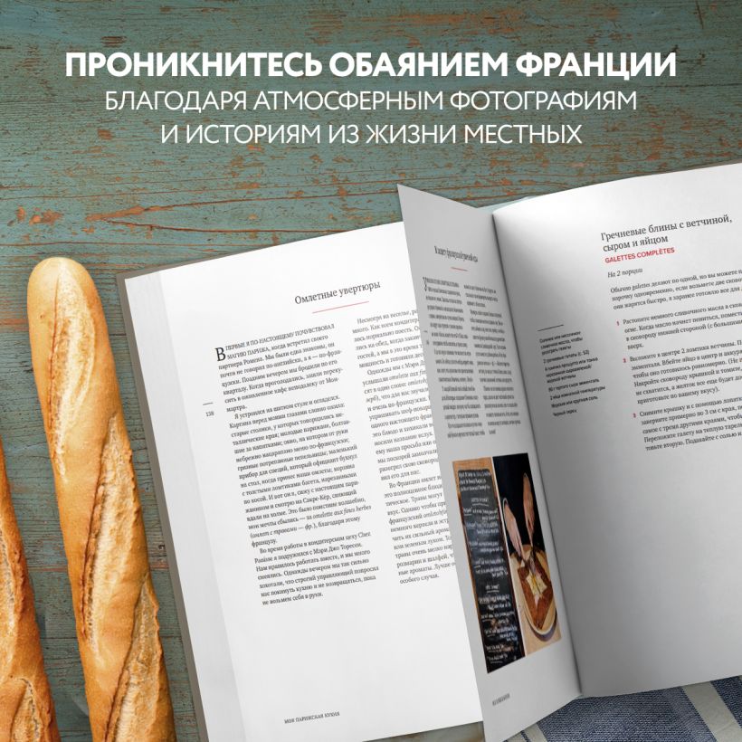 Основная часть поделена на 6 глав: закуски, первые и основные блюда, гарниры, десерты и выпечка (в общей сложности 100 рецептов!). Рецепты в каждой главе перемежаются с авторскими историями и воспоминаниями о тех или иных блюдах или продуктах. Все рецепты являются отражением того, что едят современные парижане: сочетание традиций и упрощенного современного подхода.