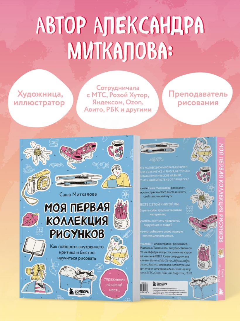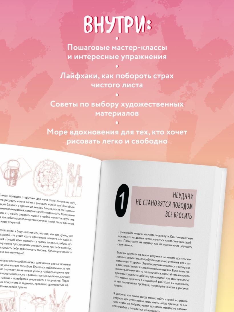 На его страницах художница и иллюстратор Саша Миткалова расскажет, как безболезненно преодолеть одну из самых распространенных проблем — страх перед чистым листом. Вместе с ней вы подберете нужные художественные материалы, разберете основные правила рисования и начнете собирать свои первые коллекции рисунков. А задания и упражнения, созданные Сашей, добавят в процесс обучения интерактивности и вдохновят каждого на новые рисунки.