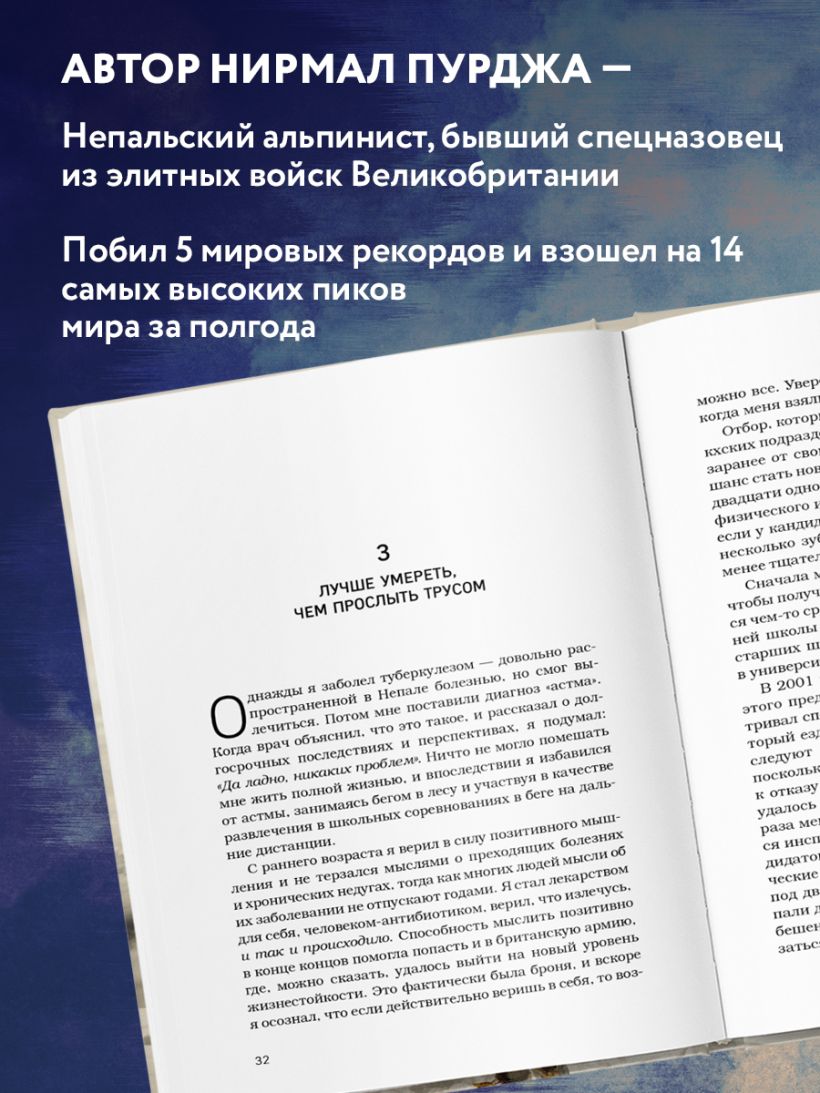 Перед вами не просто хроника восхождений — это история мужества, веры и безумной решимости идти до конца, когда мир говорит «невозможно». В книге Нирмал делится тем, что осталось за кадром рекордов: страхом и болью, насмешками и сомнениями, верой товарищей и любовью близких.