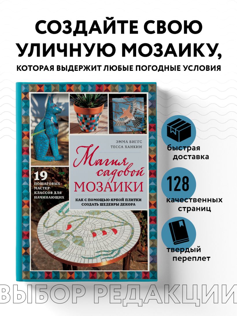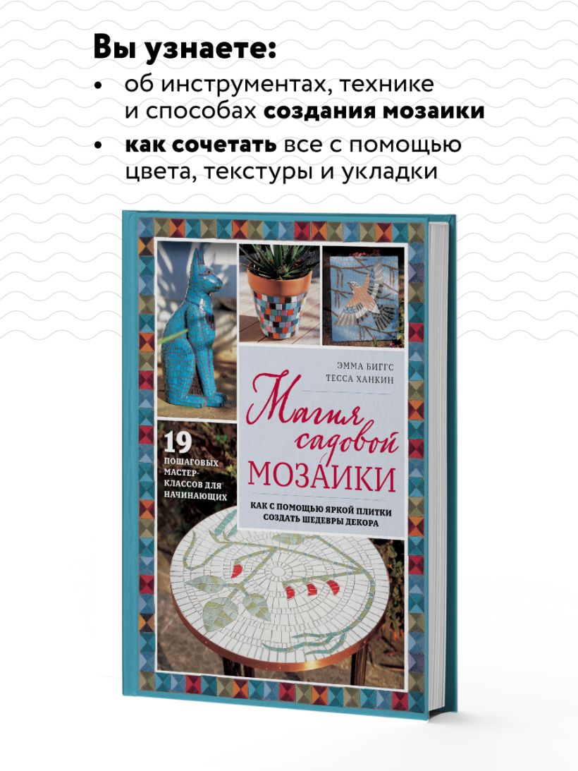 Мозаика придает индивидуальность декору: украшению дорожек в саду, горшкам, скульптурам, местам для сидения. Придает стенам яркости, летом дополняет цветущие растения, а в тусклые зимние месяцы создает визуальный акцент. Она долговечна, поэтому хорошо подходит для создания дизайна на открытом воздухе. Хотите своими руками создать яркий, красивый мозаичный проект в вашем саду, который будет радовать вас долгие годы? Эта книга вам поможет!