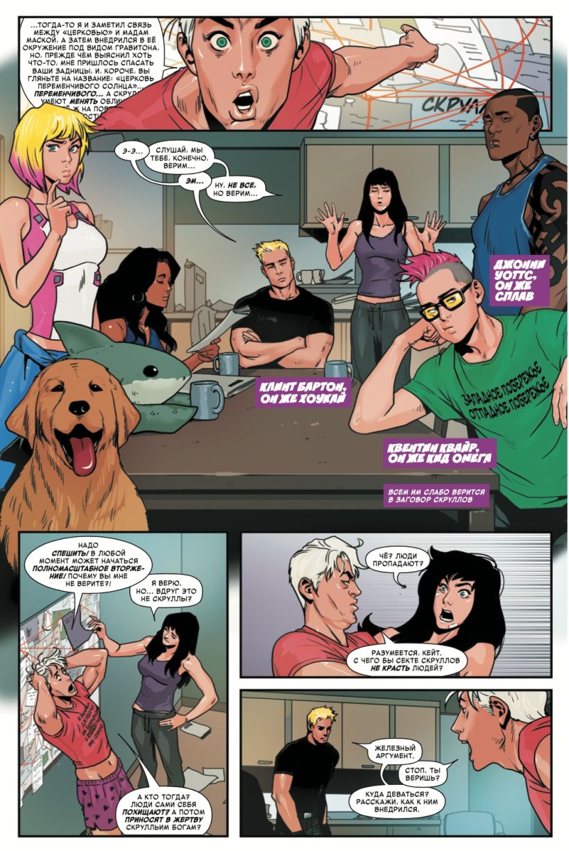 ГРЯДЁТ НОВАЯ ЭРА в истории величайших героев Тихоокеанского побережья! Встречайте: Хоукай (ваша любимая Кейт Бишоп!), второй Хоукай (не менее любимый Клинт Бартон!), Америка Чавес, Кид Омега (Квентин Квайр!), Гвенпул (Гвендолин Пул!) и парень по прозвищу Сплав (а это кто?)! Всё верно: они — новые Мстители Западного побережья!