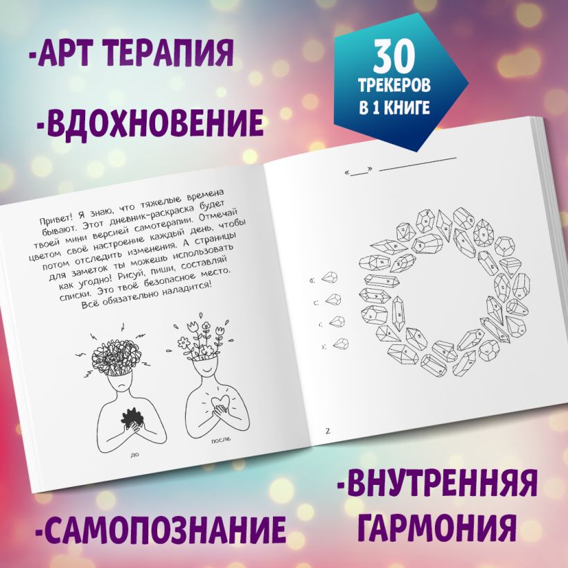 В ней собрано более 30 трекеров, которых хватит почти на 3 года. Отмечай разными цветами определенное настроение дня, чтобы в конце месяца увидеть яркую картинку! Но помни, даже если плохих дней больше, дальше правда будет лучше. Твои «плохие» чувства также важны. Эта маленькая книга поможет тебе взглянуть немного иначе на свой внутренний мир, а раскраски и страницы для заполнения станут твоим безопасным пространством для творчества.