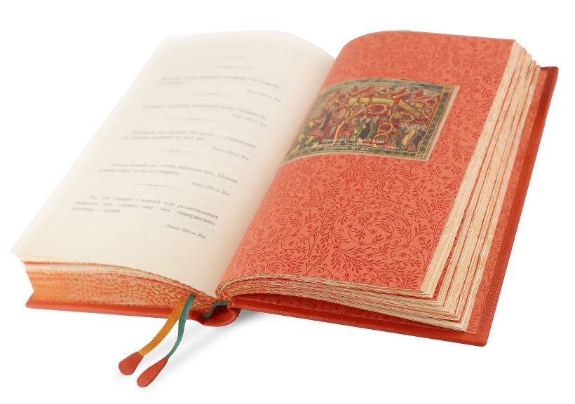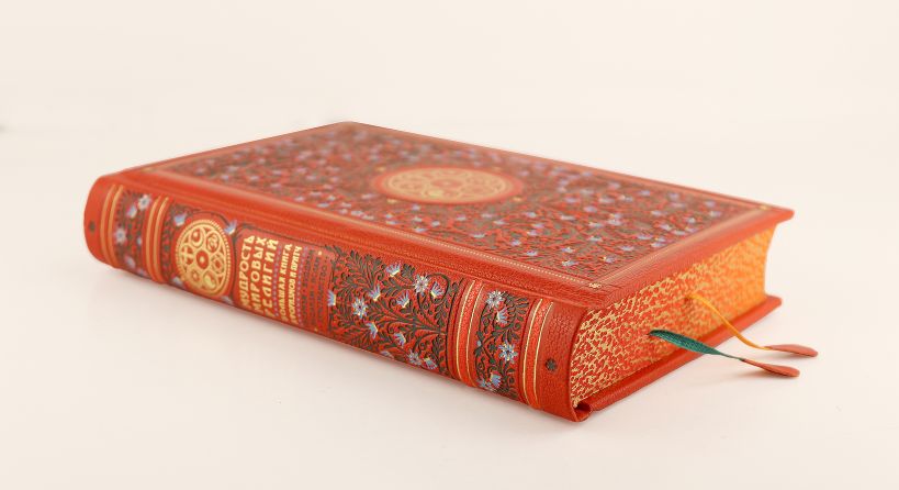 Коллекционное издание в козьей коже цвета красного апельсина. Переплет украшен глубоким рельефным, красочным и золотым тиснением высокого качества. Старинная технология создания владельческих переплетов воспроизведена в точности в соответствии с описаниями старых мастеров — книга переплетена и сшита вручную, с использованием ручных инструментов. Трудоемкость технологии позволяет изготовить лишь ограниченное количество экземпляров.