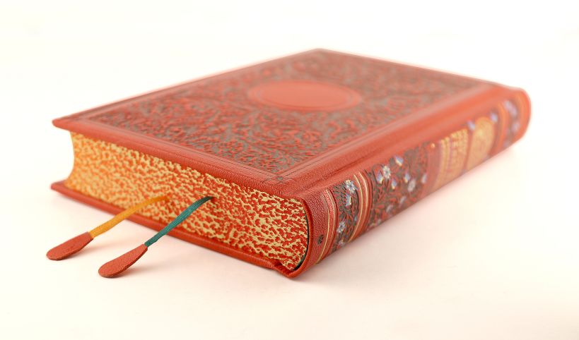 Форзацы орнаментированы. Трехсторонний художественно оформленный обрез. Золотистые лента для закладывания страниц и каптал, скрепляющий верх и низ объемного тома, изготовлены из шелка.