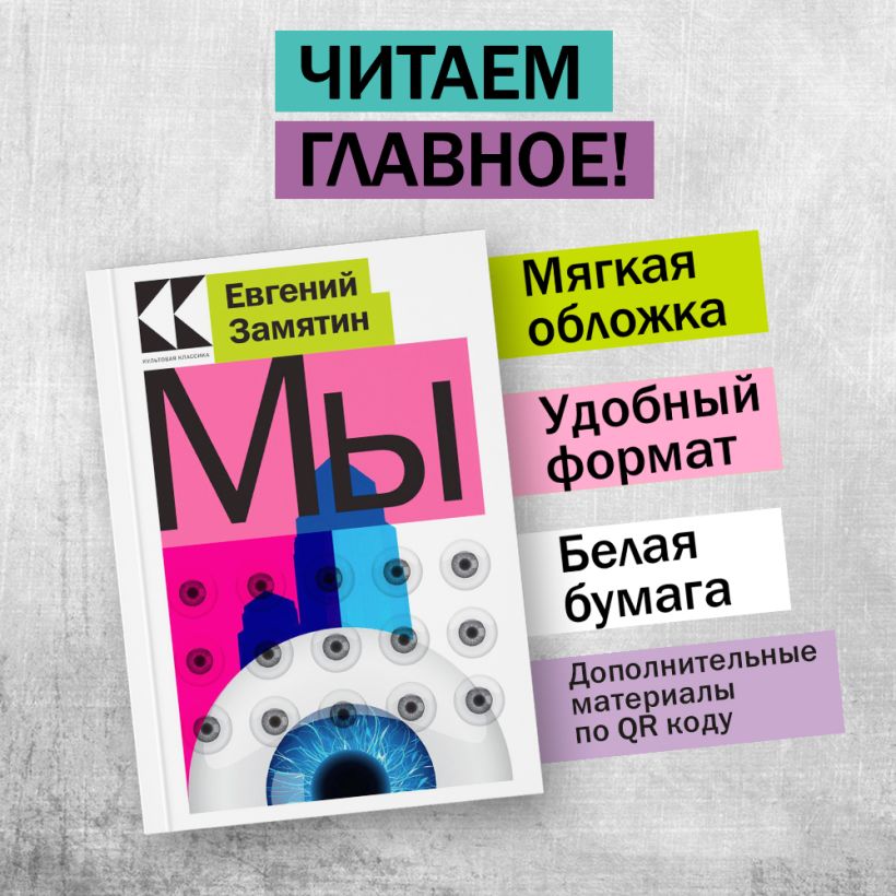 «Мы» — это мир XXXII века, где имена заменены на буквы и цифры, люди едят продукты переработки нефти, государство контролирует всё, включая интимную жизнь граждан, а наличие у человека души — повод для визита к психотерапевту. Фантастика, скажете вы, — можно придумать всё что угодно. Да, но за это «что угодно», написанное Евгением Замятиным в 1920 году, автору устроили травлю, а роман в СССР был опубликован лишь 68 лет спустя.