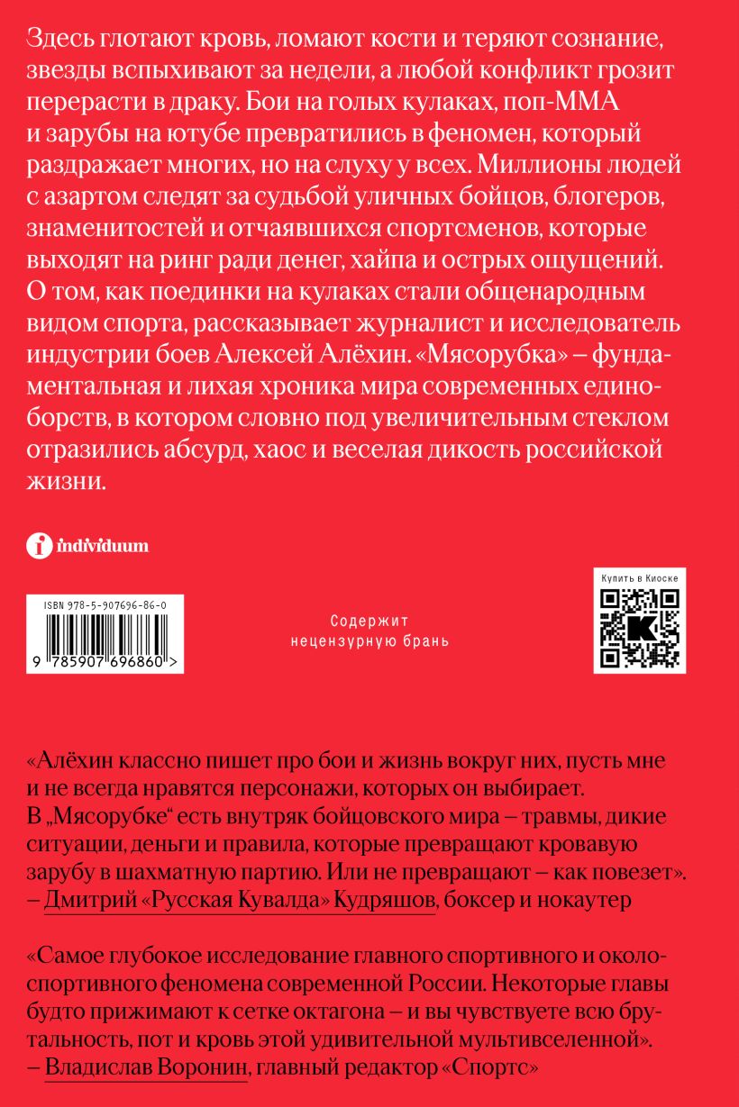 Здесь глотают кровь, ломают кости и теряют сознание, звезды вспыхивают за недели, а любой конфликт грозит перерасти в драку. Бои на голых кулаках, поп‑ММА и зарубы на ютубе превратились в феномен, который раздражает многих, но на слуху у всех. Миллионы людей с азартом следят за судьбой уличных бойцов, блогеров, знаменитостей и отчаявшихся спортсменов, которые выходят на ринг ради денег, хайпа и острых ощущений. О том, как поединки на кулаках стали общенародным видом спорта, рассказывает журналист и исследователь индустрии боев Алексей Алёхин. "Мясорубка" — фундаментальная и лихая хроника мира современных единоборств, в котором словно под увеличительным стеклом отразились абсурд, хаос и веселая дикость российской жизни.