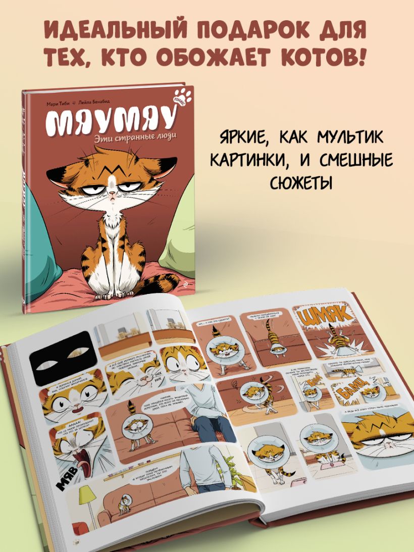 Из небольшого комикса вы узнаете, как повседневные людские заботы, которые вам кажутся пустяковыми, могут сильно озадачить вашего любимца. Истории Мяумяу растрогают и позабавят вас, но также помогут понять вашего котика и найти к нему подход.