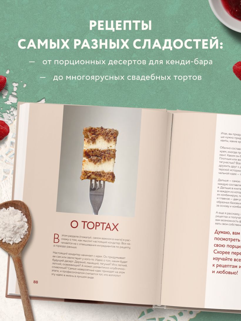 Испеките торт, о котором скажут «вау»! Книга творческого кондитера Анастасии Поповой (nastasia_slasti) поможет воплотить мечту в реальность. Это уже не первый ваш торт и вы хотите выйти за рамки привычных рецептов? Книга Анастасии откроет десятки идей десертов с неожиданными вкусами, оригинальными текстурами и эффектными разрезами, способными вызвать настоящий фурор. Что внутри книги: - авторские бисквитные торты с «твистом» — необычные начинки, ингредиенты и текстуры, например «Дубайский шоколад» или «Карамельная тыковка»; - красивые геометричные разрезы, скрытые под слоем плотного крема; - проработанные до грамма рецепты: каждая составляющая торта расписана максимально подробно; - объемная теория: от выбора продуктов до финальной сборки с пошаговыми фото; - базовые рецепты и техники: идеальный крем для покрытия, меренга для бисквита, пропитки и натуральные ароматизаторы; - яркие фотографии — вы увидите каждый торт во всей красе. Поднимите свой уровень кондитерского мастерства и научитесь создавать торты, которые невозможно забыть!
