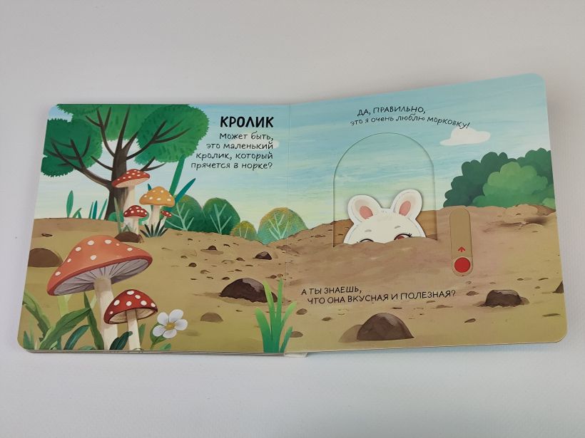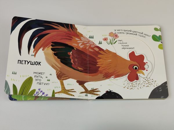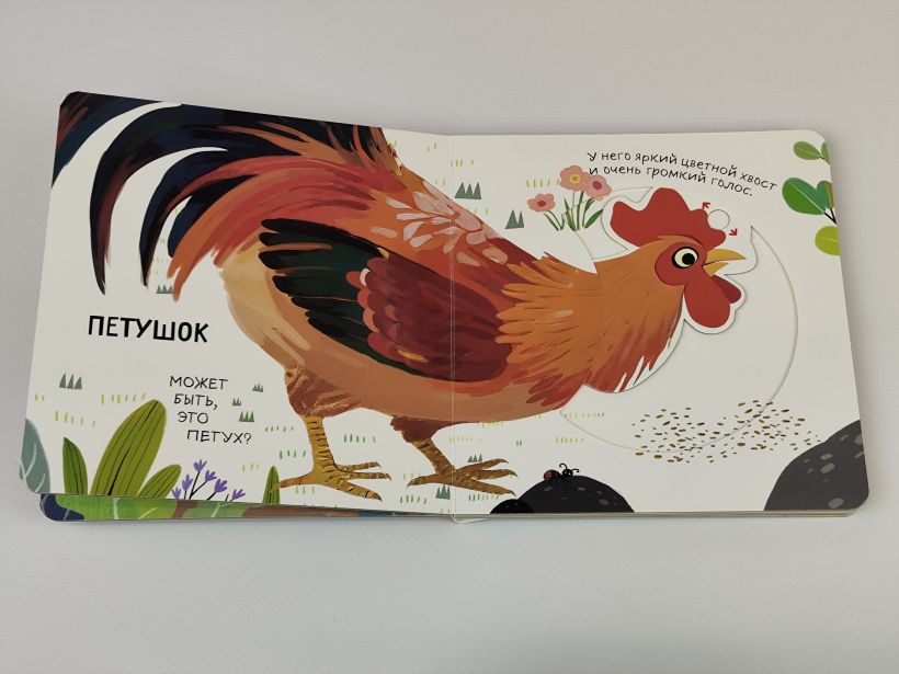 Книга сделана из толстого прочного картона с безопасными скругленными углами — малыш сможет легко переворачивать странички самостоятельно. Игра с книгой начинается прямо с обложки, ведь там находится подвижная деталь!