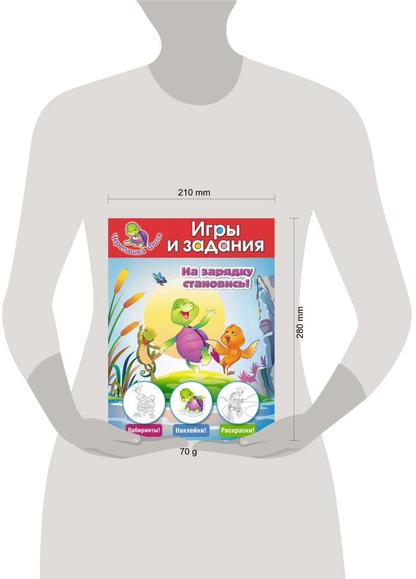 Черепашонок Филя и его друзья приглашают тебя на весёлую зарядку. Решай головоломки о спорте, раскрашивай чемпионские картинки и получай в подарок наклейки для мячиков, скакалок, гантелей и обручей!