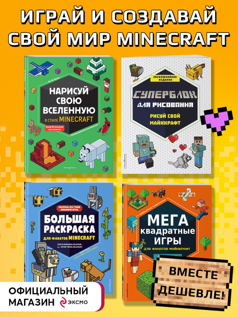 Minecraft вышел в реал! Насладитесь целой коллекцией занимательных книг по любимой вселенной. Вас ждут раскраски, головоломки, книга-гид по рисованию на уникальной изометрической сетке и наша суперновинка — блок с пустой изометрической сеткой для воплощения всех творческих идей. Создавайте свою вселенную на страницах книг — играйте с любимыми героями и создавайте свою особую реальность — где только веселье, краски и творчество.
