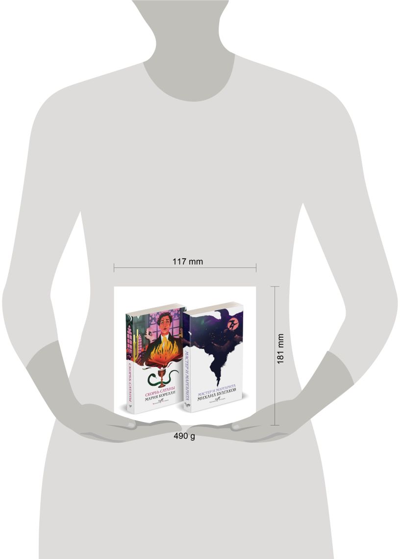 В комплект входят 2 книги: «Скорбь сатаны» Марии Корелли и «Мастер и Маргарита» Михаила Булгакова. Романы объединяет много тем — от поиска, исследования бытия до расплаты и наказания — и, конечно, образ сатаны, который описан в этих произведениях по-разному.