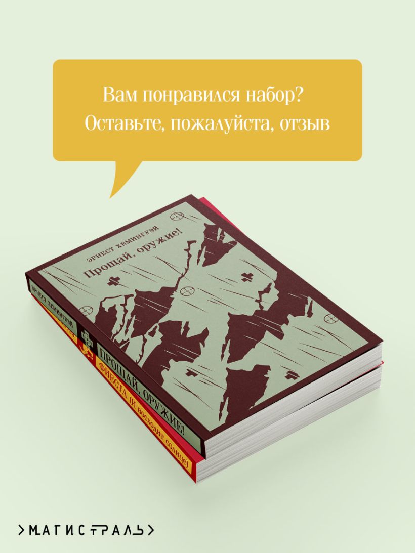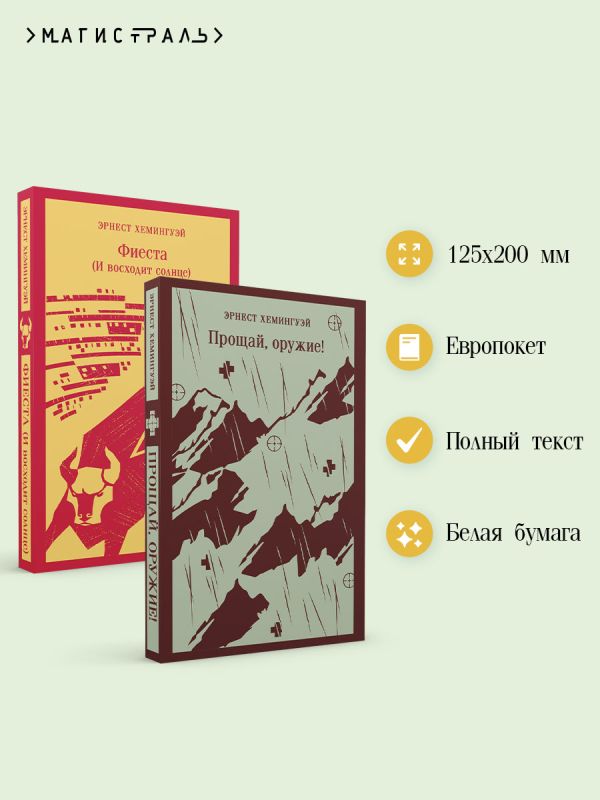 В комплект вошли две знаковые книги Эрнеста Хемингуэя — «Прощай, оружие!» и «Фиеста (И восходит солнце)», посвящённые судьбам поколения, пережившего ужасы Первой мировой войны. В автобиографичном романе «Прощай, оружие!» автор глубоко и пронзительно показывает трагизм любви в военное время, бессмысленность и разрушительную силу войны через историю молодого американца-фельдшера на итальянском фронте. Роман «Фиеста» рисует портрет потерянного поколения — молодых людей, вернувшихся с войны и пытающихся обрести смысл жизни в послевоенной Европе. В обеих книгах тема войны выступает как фон для эмоциональных драм, разочарования и поиска утраченных ценностей, а стиль Хемингуэя отличается лаконизмом, правдивостью и внутренней болью, которые сделали его одним из крупнейших хроникёров своей эпохи.