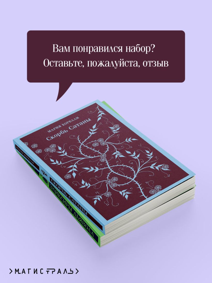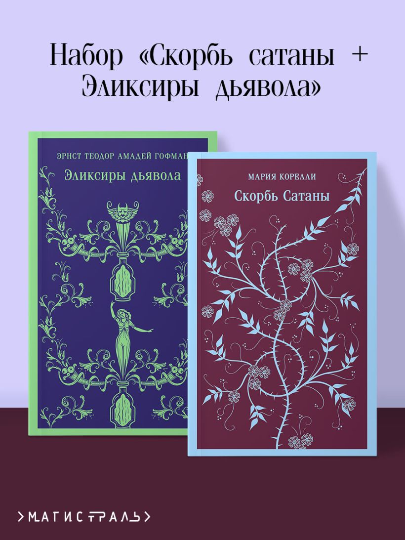 В комплект входят 2 книги: "Скорбь сатаны" Марии Корелли и "Эликсиры дьявола" Гофмана. Романы объединяет много тем - от поиска, исследования бытия, до расплаты и наказания - и конечно, образ сатаны, который подан во всех трёх произведениях по-разному.