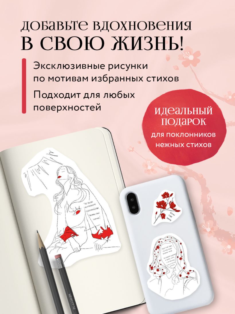 Эксклюзивные рисунки, выполненные самой Шахназ, в сопровождении любимых стихов из ее сборников. Можно клеить на любую поверхность! В набор входит один лист формата А5 с шестью уникальными стикерами.