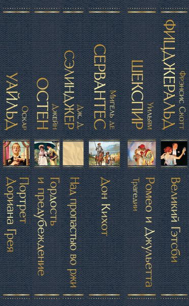 В комплект входят 6 книги: "Гордость и предубеждение" Дж. Остен, "Дон Кихот" Сервантеса, "Ромео и Джульетта. Трагедии" Шекспира, "Портрет Дориана Грея" О. Уайльда, "Великий Гэтсби" Ф.С. Фицджеральда, "Над пропастью во ржи" Дж. Д. Сэлинджера.