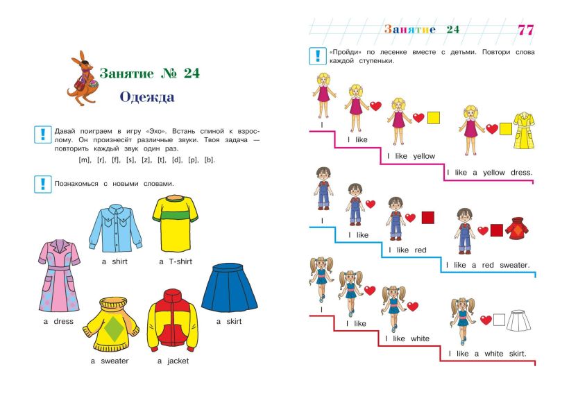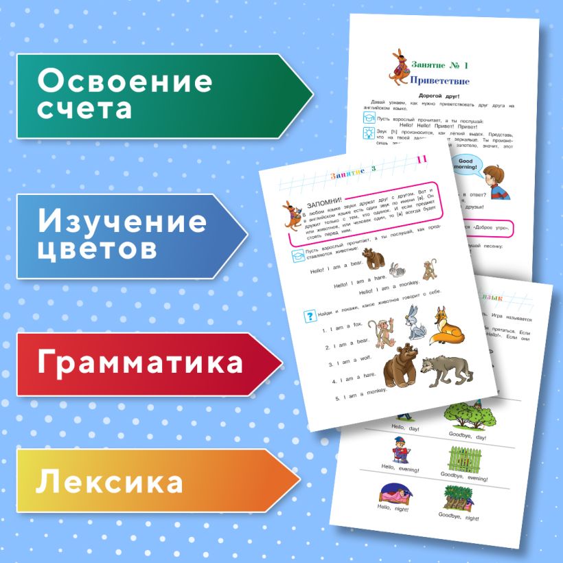 Выполняя интересные игровые задания, ребенок выучит новую лексику и закрепит уже известную, познакомится в игровой форме с простыми грамматическими конструкциями. Занимаясь, дошкольник выучит новые иностранные слова и песенки, научится составлять небольшие рассказы и задавать вопросы по-английски. Увлекательные упражнения и красочные иллюстрации способствует поддержанию интереса к занятиям.