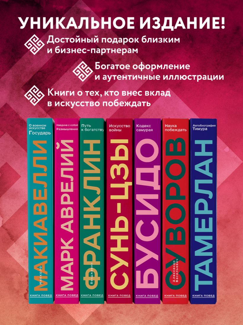 «Книга побед» — коллекционная серия подарочных иллюстрированных книг, объединившая фигуры легендарных исторических личностей, которые внесли каждый свой вклад в искусство побеждать. Издания, вошедшие в серию, посвящены не только премудростям военной науки, тактике, стратегии, но и воспитанию духа, воли и качеств настоящего лидера, необходимых для победы. Собеседниками и учителями выступают легендарные полководцы, мыслители, государственные деятели.