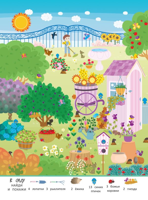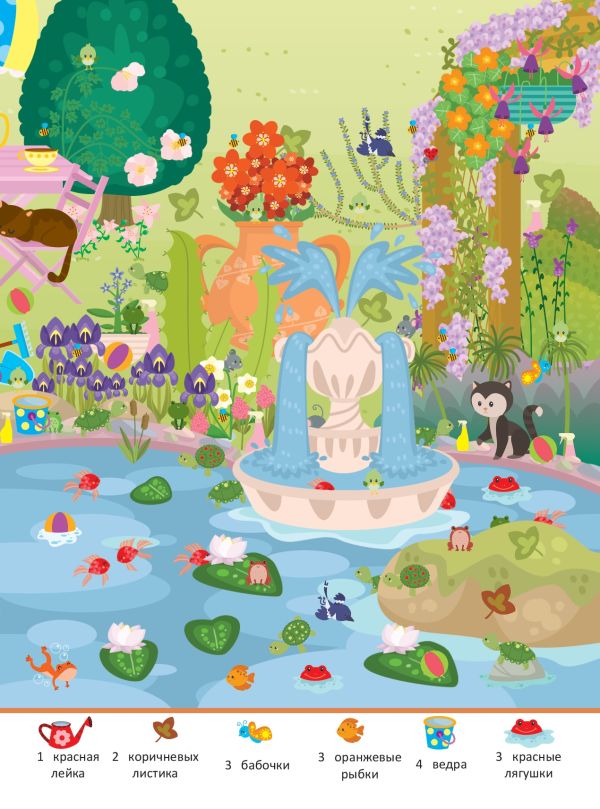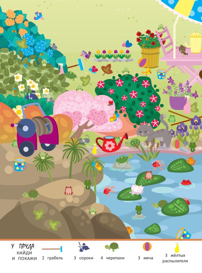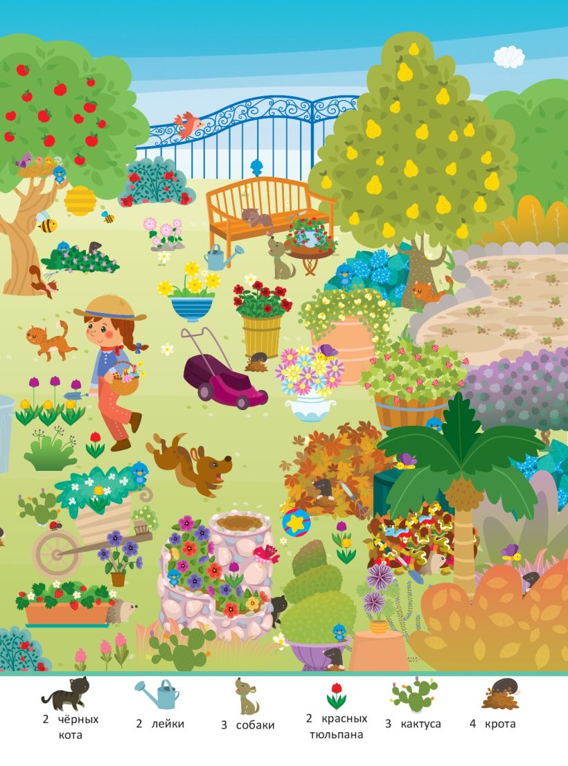 На каждой странице скрыто множество небольших предметов и животных — придется напрячь зрение, чтобы отыскать их все.