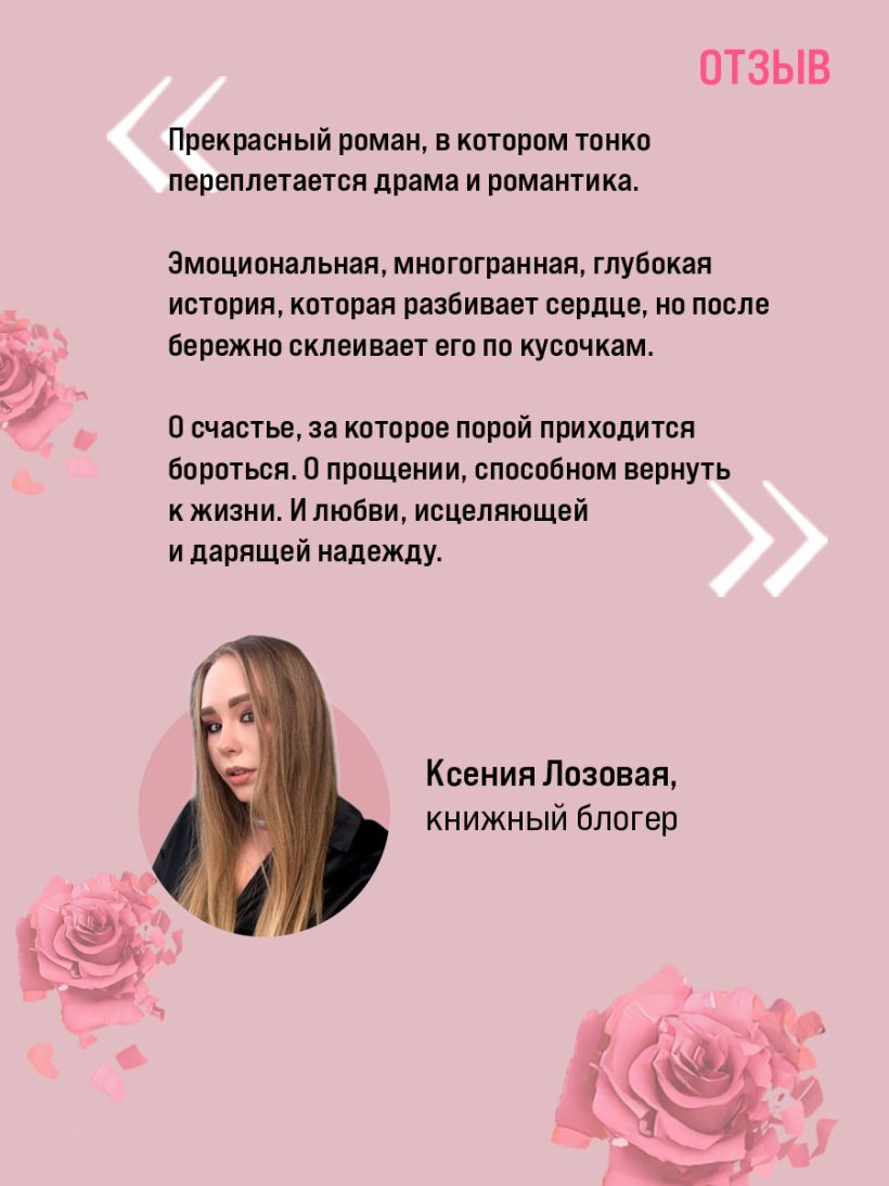 «Прекрасный роман, в котором тонко переплетается драма и романтика. Эмоциональная, многогранная, глубокая история, которая разбивает сердце, но после бережно склеивает его по кусочкам. О счастье, за которое порой приходится бороться. О прощении, способном вернуть к жизни. И любви, исцеляющей и дарящей надежду». — КСЕНИЯ ЛОЗОВАЯ, книжный блогер