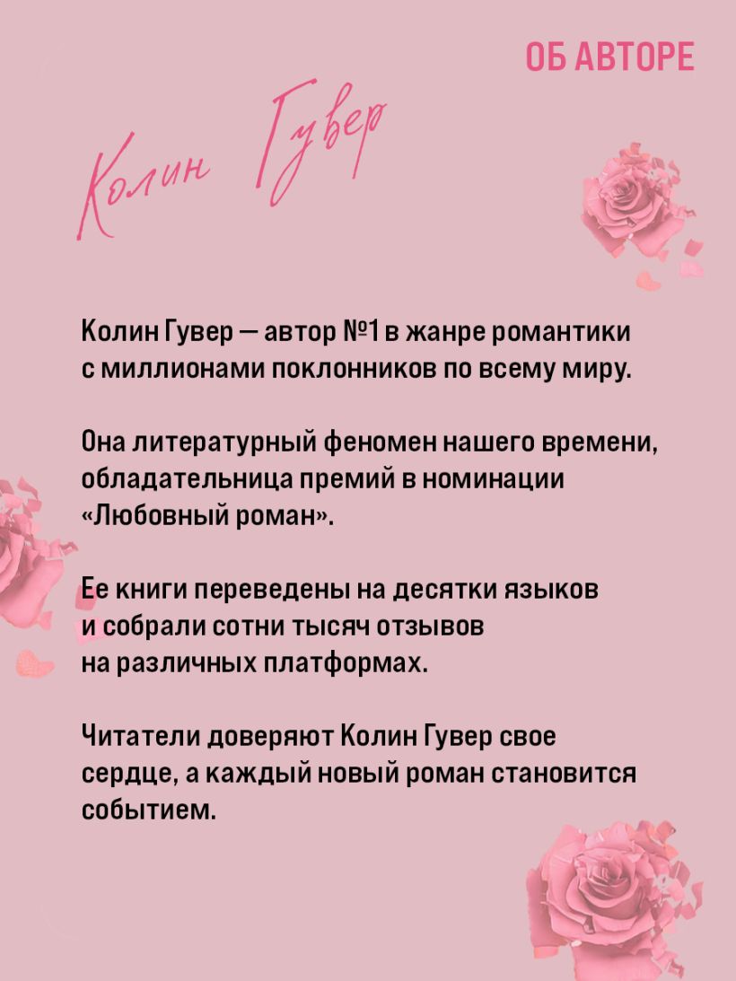 Колин Гувер — автор, которому читатели доверяют свое сердце. Она — мировой тренд, литературный феномен нашего времени, троекратная обладательница премии Goodreads Choice Award в номинации «Любовный роман». Ее произведения переведены на десятки языков. Продажи книг Колин Гувер превысили продажи Стивена Кинга и Джорджа Мартина.