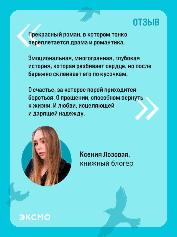 «Прекрасный роман, в котором тонко переплетается драма и романтика. Эмоциональная, многогранная, глубокая история, которая разбивает сердце, но после бережно склеивает его по кусочкам. О счастье, за которое порой приходится бороться. О прощении, способном вернуть к жизни. И любви, исцеляющей и дарящей надежду». — КСЕНИЯ ЛОЗОВАЯ, книжный блогер