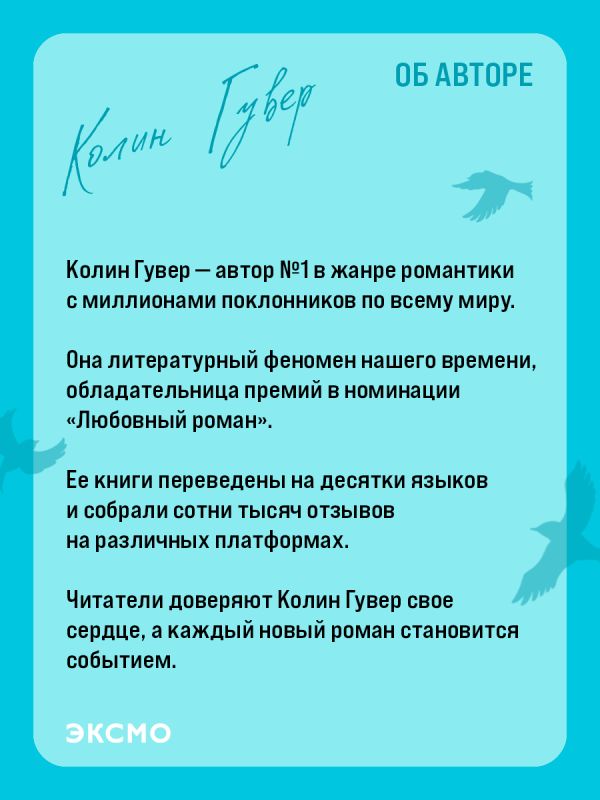 Колин Гувер — автор, которому читатели доверяют свое сердце. Она — мировой тренд, литературный феномен нашего времени, троекратная обладательница премии Goodreads Choice Award в номинации «Любовный роман». Ее произведения переведены на десятки языков. Продажи книг Колин Гувер превысили продажи Стивена Кинга и Джорджа Мартина.