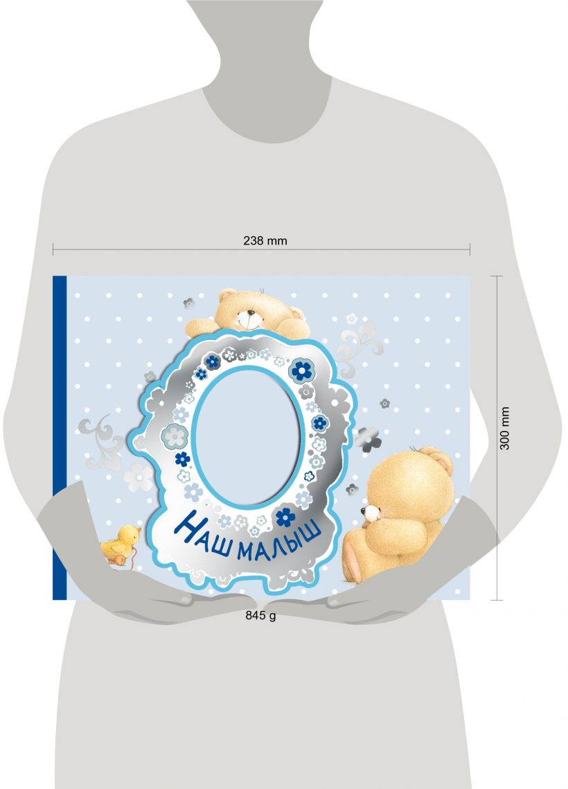 В фотоальбоме есть 10 открывающихся окошек для приклеивания самых лучших фото малыша, а также место для приклеивания более 40 фотографий, 2 конверта (для первого УЗИ и для первого локона) и большой раскладной лист, на котором можно отмечать все этапы развития малыша.