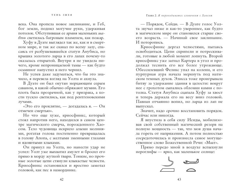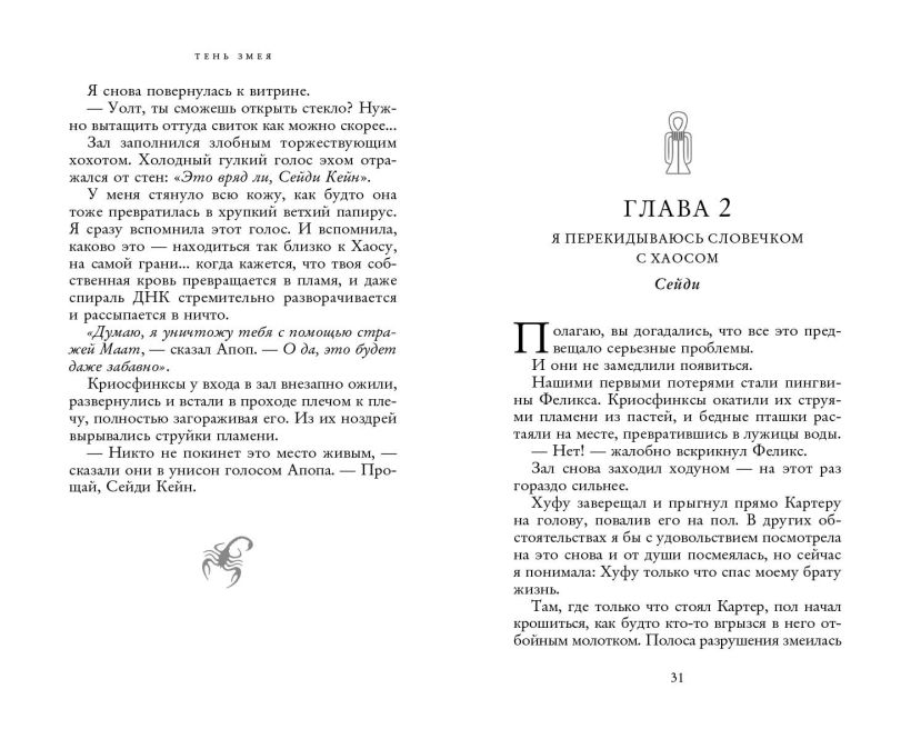 Все, чего люди добились со времен пирамид, уже завтра может стать пылью — ведь Апоп, Змей Хаоса, жаждет разрушить человеческую цивилизацию и саму нашу реальность. Чтобы помешать ему, Картер и Сейди Кейн готовы сделать все, что в их силах. И даже больше. Юным магам предстоит отыскать тень змея, заточить ее в артефакт, а затем прочитать одно очень сложное заклинание. Ошибка в нем будет стоить ребятам жизни… но этот призрачный шанс лучше, чем никакого! Сейди Кейн не может решить, какой из двух парней нравится ей больше. Картер переживает, что не сумеет оправдать возложенные на него ожидания… Но эти проблемы ничто по сравнению с надвигающимся концом света!