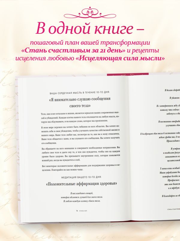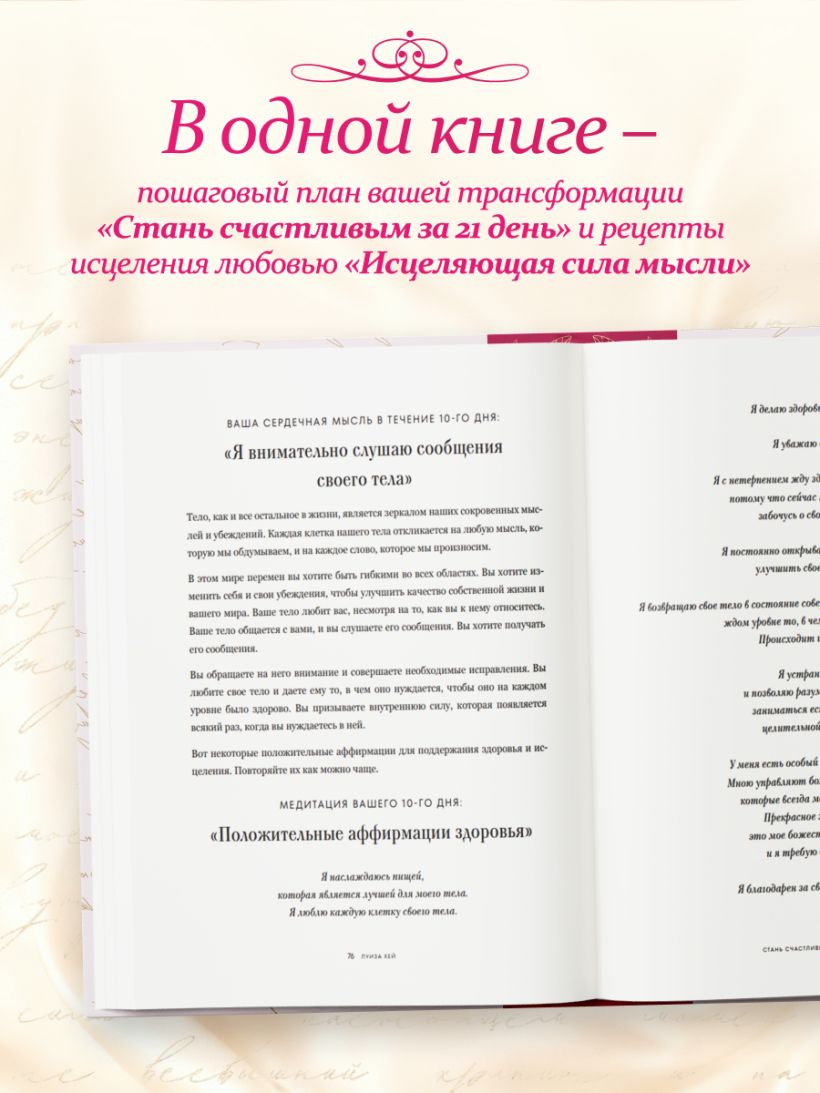 В этом подарочном сборнике — два самых ярких мировых бестселлера Луизы Хей: «Исцеляющая сила мысли» и «Стань счастливым за 21 день». Черпайте вдохновение в позитивных мыслях и утверждениях — знаменитых аффирмациях автора, и скоро вы испытаете на себе их силу!