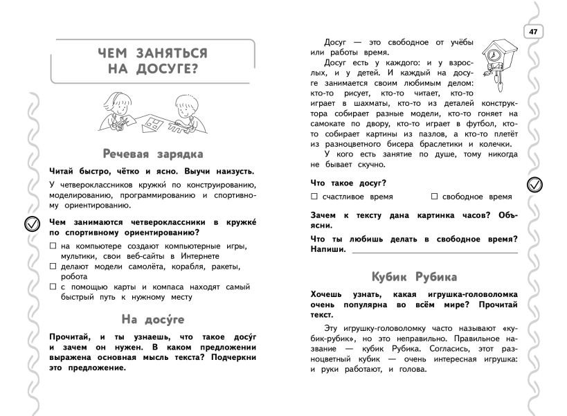 Каждый раздел предлагает разнообразные задания, которые помогут активизировать личный словарный запас ребёнка. Приводятся краткие сведения о происхождении слов, примеры их употребления, стихотворения для заучивания наизусть, а также тексты для расширения кругозора. Благодаря прогрессивной авторской методике четвероклассники не только усовершенствуют навык чтения, но и значительно обогатят свой словарь, улучшат речевые способности и существенно повысят общую эрудицию.