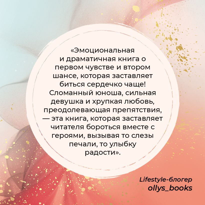 «Эмоциональная и драматичная книга о первом чувстве и втором шансе, которая заставляет биться сердечко чаще! Сломанный юноша, сильная девушка и хрупкая любовь, преодолевающая препятствия, — эта книга, которая заставляет читателя бороться вместе с героями, вызывая то слезы печали, то улыбку радости». — Lifestyle-блогер ollys_books