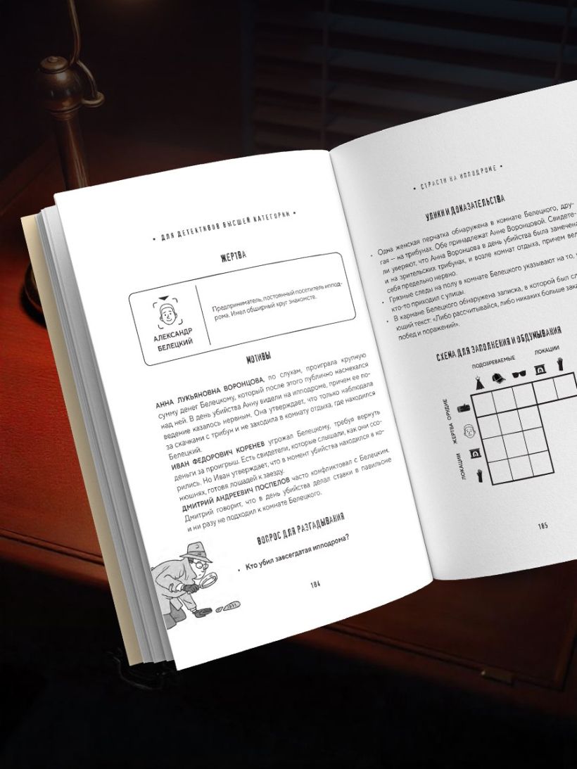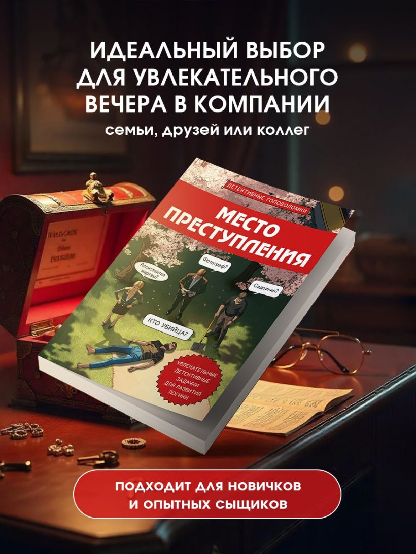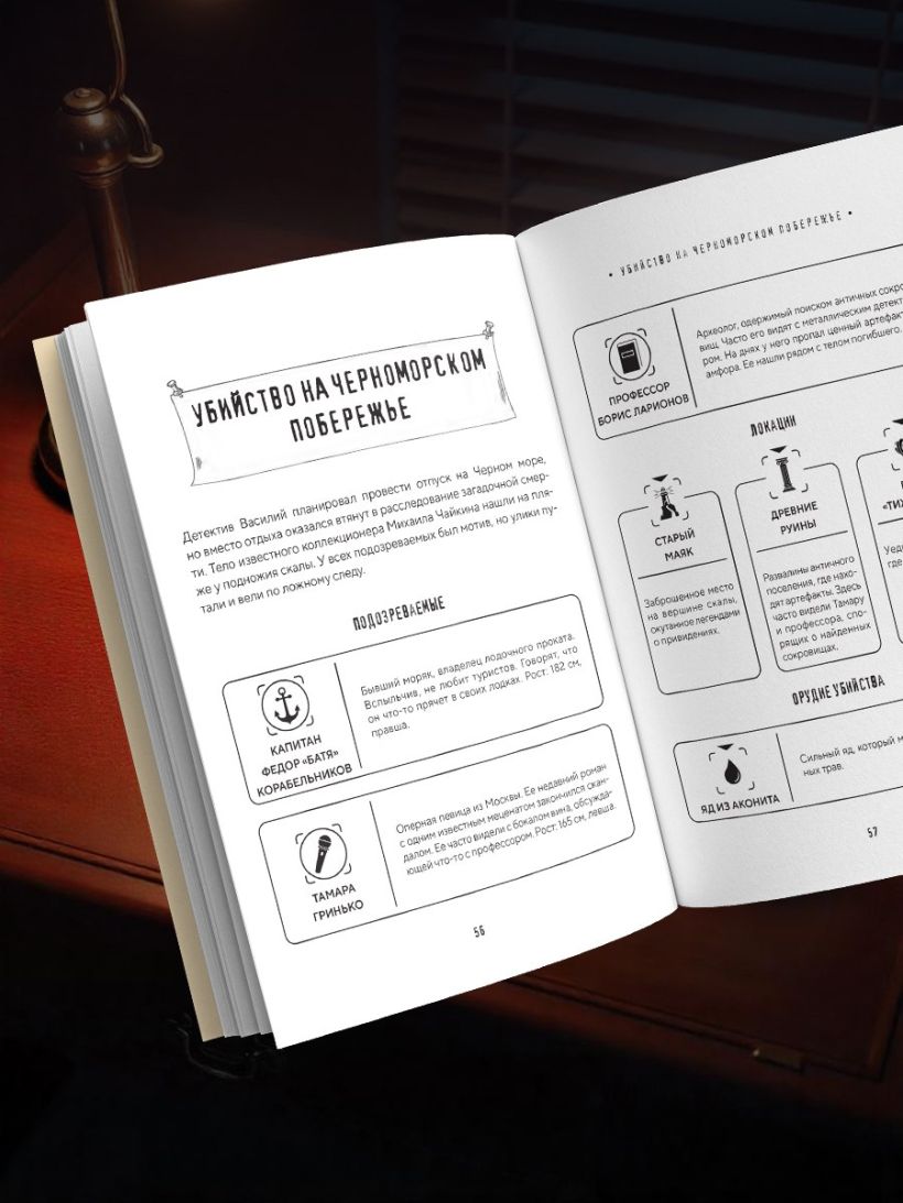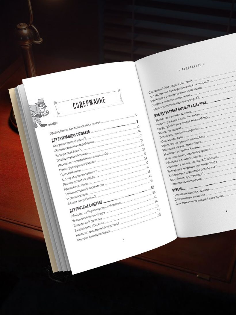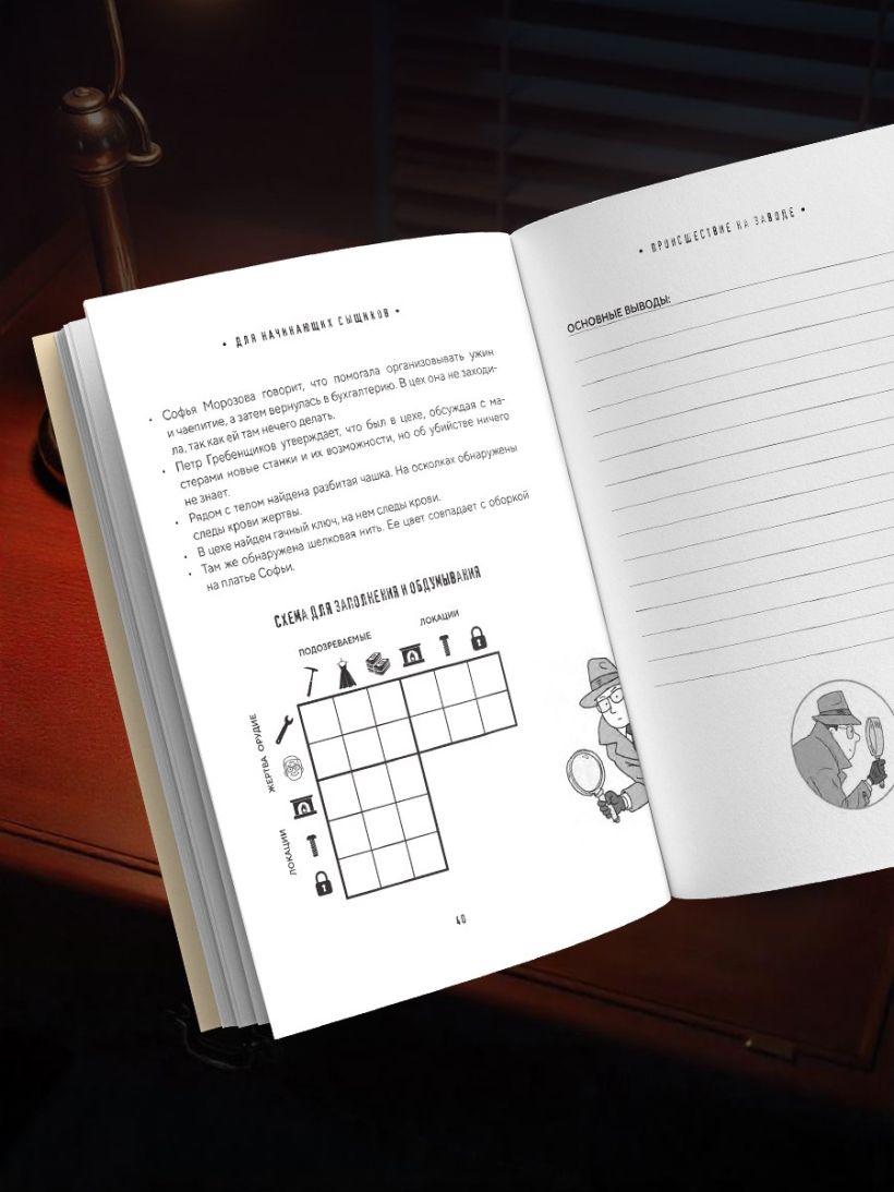 Представьте, что вы отправились в поход, но оказались в эпицентре загадочного убийства: в соседнем лесу нашли застреленного охотника Сергея, и пуля в его сердце заставляет задуматься о том, что он был не один в момент трагедии. Кто же убийца — егерь, который никогда не расстается со своим ружьем? Местная повариха, которой Сергей отказался оплачивать свой обед? А может быть, лучший друг жертвы, с которым Сергей поругался на днях? С этой серией книг вы сможете примерить на себя роль настоящего сыщика! В книгах собраны самые разные детективные задачки, начиная от кражи денег и заканчивая жутким убийством. Вас ждёт 40 головоломок любого уровня сложности: их будет под силу разгадать как начинающим детективам, так и специалистам высшей категории. Прокачайте логику, разгадывая запутанные дела: изучайте мотивы каждого подозреваемого, обращайте внимание на зацепки и улики, сопоставляйте факты, заполняйте дедуктивные сетки — и вы обязательно придете к верным выводам! Добро пожаловать в мир интриг и загадок!