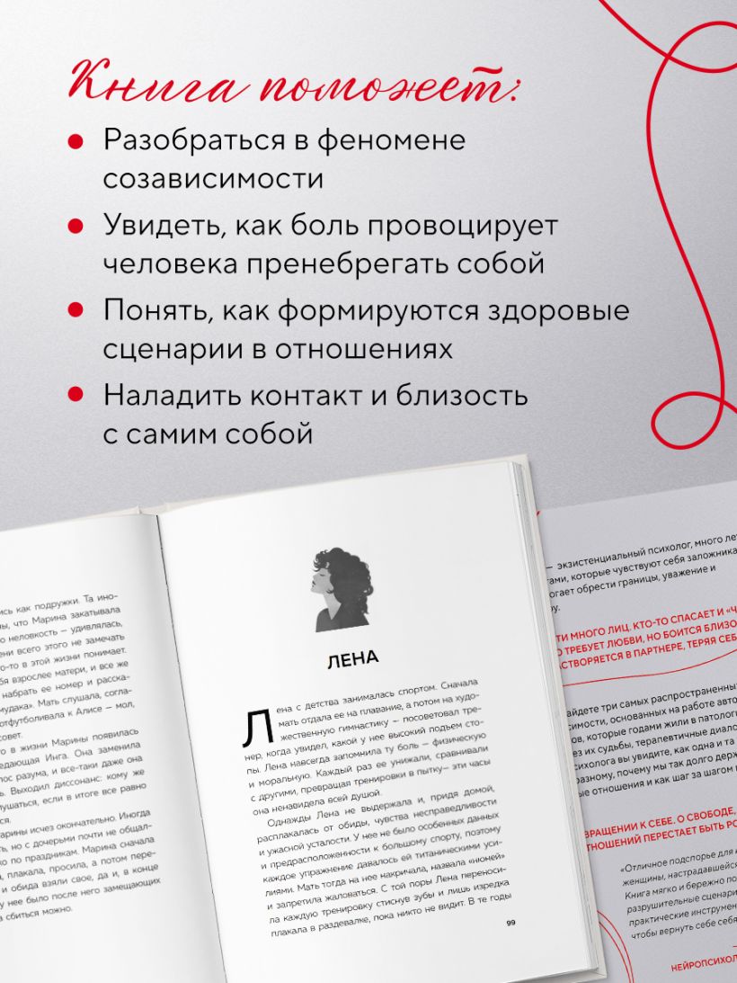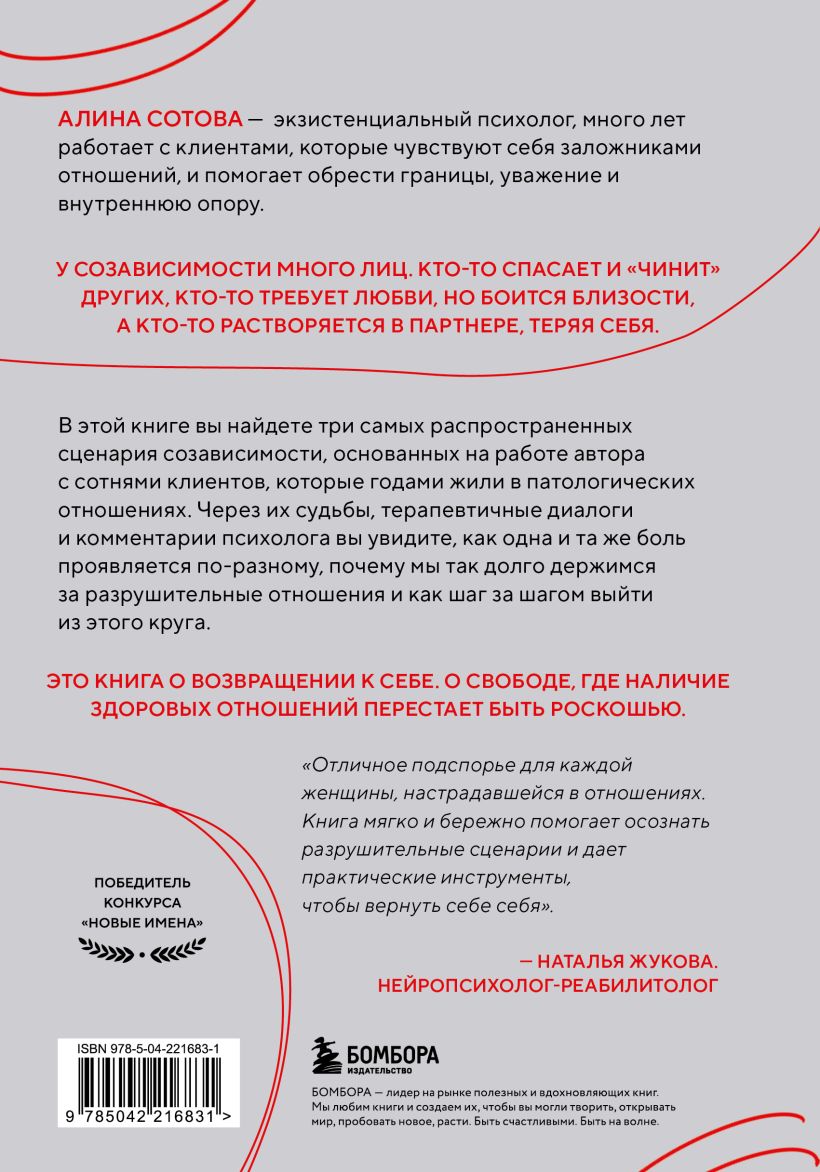«Отличное подспорье для каждой женщины, настрадавшейся в отношениях. Она мягко и бережно помогает осознать разрушительные сценарии и дает практические инструменты, чтобы вернуть себе себя». — Наталья Жукова, нейропсихолог-реабилитолог, магистр психологических наук