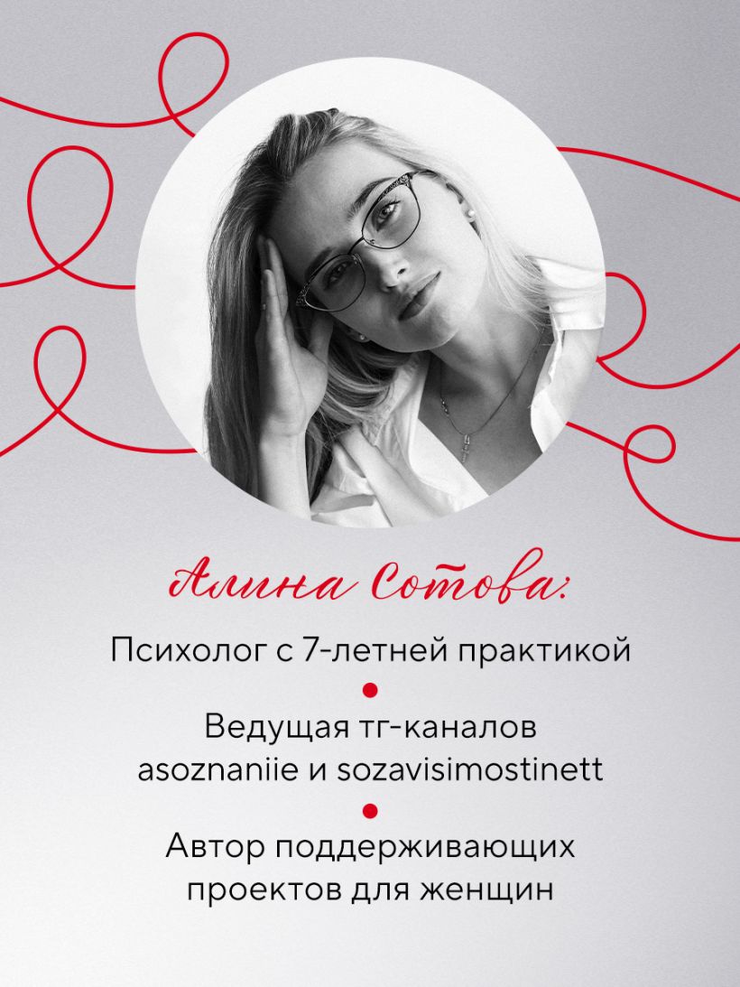АЛИНА СОТОВА — экзистенциальный психолог, много лет работает с клиентами, которые чувствуют себя «заложниками» отношений, и помогает обрести границы, уважение и внутреннюю опору.