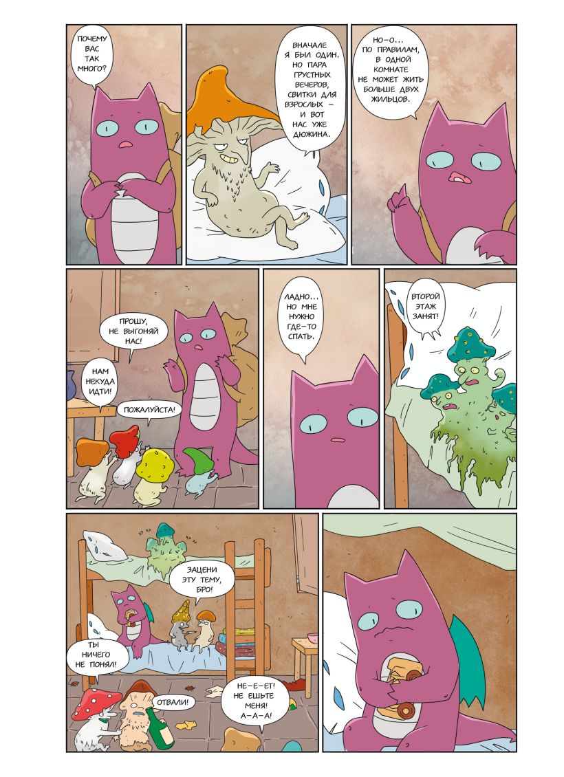 Боишься публичных выступлений, высоты, ответственности? А еще насекомых, грозы или монстров под кроватью? Каждый сталкивался с такими страхами и часто прятался, вместо того чтобы посмотреть им в глаза. Как побороть свои страхи и пройти мягкую терапию? Тебе поможет… кот! Он любит устраивать суету, гоняться за едой и ворчать на хозяйку, но при этом делится психологическими советами, словно заправский психолог. Эту необычную историю создала молодая и талантливая девушка — Лапка Художника — иллюстратор и будущий психолог. Она ведет веселый блог с комиксами и короткими жизненными роликами, в которых ты точно узнаешь себя. Там и кот, скачущий по ночам, и комар, сводящий с ума, и мозг, застрявший на старой песне из рекламы. Котокомикс для тех, кто: - устал беспокоиться и тревожиться по пустякам; - хочет понять свои эмоции без скучных теорий; - готов прислушаться к советам кота-психолога; - обожает юмор, комиксы и жизненные зарисовки. Каждая глава обозначена определенным цветом, поэтому ты никогда не запутаешься, где именно находишься: в зеленой главе с детскими страхами или в фиолетовой — с экзистенциальными. «Эта книга как теплый разговор с собой в моменты тревоги. С юмором, легкостью и неожиданной глубиной она помогает взглянуть на страхи по-другому — мягко, бережно и с улыбкой. Кот-психолог протянет свою лапку помощи. И расскажет, как легче и спокойнее воспринимать эту жизнь». — Любовь Стяпшина, автор и иллюстратор метафорических открыток «Дом твоего сердца» «Добрые комиксы о девочке, которая боялась всего на свете. Но, ура, рядом появляется кот: пушистый, спокойный и мудрый. Он не смеётся над страхами, а объясняет, что всё не так уж страшно. Очень милая, тёплая и поддерживающая книжка. Особенно когда тревожно и хочется, чтобы кто-то просто был рядом». — Алла Гончарова, автор проекта Curavamnedura
