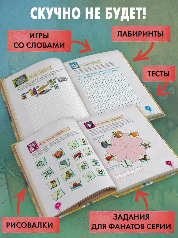 Красочно иллюстрированные задания, игры со словами, лабиринты, тесты, рисовалки — с этой книгой скучать точно не придётся! А ещё вырезные таблички для двери, самодельная коробочка и шаблон для расписания уроков.