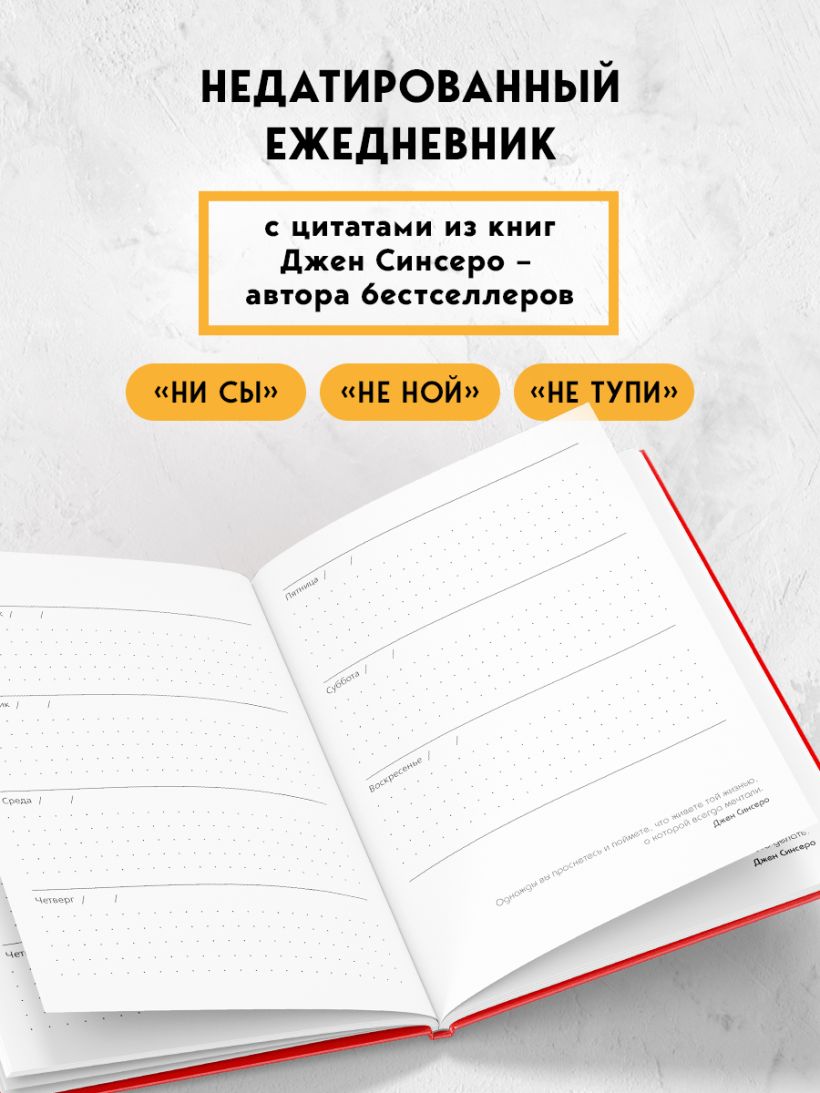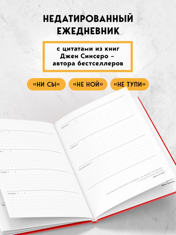 Этот ежедневник включает мотивирующие мысли и изречения автора бестселлера «НЕ ТУПИ» Джен Синсеро. Каждая из них по-своему добавляет энергии и желания добиваться целей. Ежедневник недатированный, поэтому им можно начать пользоваться в любое время.