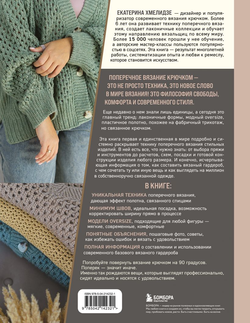 Книга дизайнера вязаных изделий Екатерины Хмелидзе — первое на русском языке подробное и системное руководство по поперечному вязанию крючком. В ней собраны теоретические основы, расчеты, пошаговые мастер-классы, схемы и советы по созданию базового гардероба — от футболки до худи.