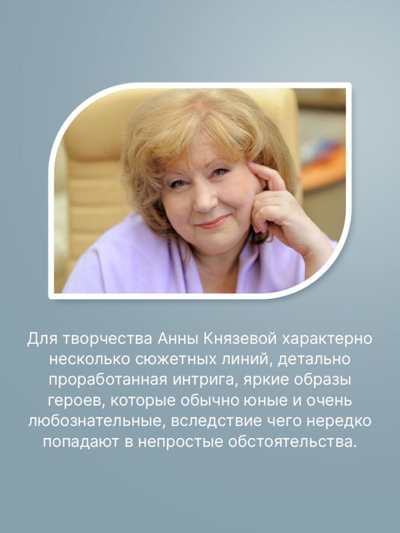 В остросюжетных романах Анны Князевой расследуются преступления, следы которых уводят в прошлое и позволяют пролить свет на его загадки. Вслед за героями вы отправитесь навстречу старинным тайнам и увлекательным приключениям!