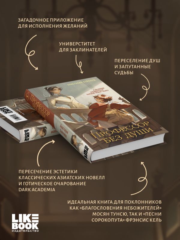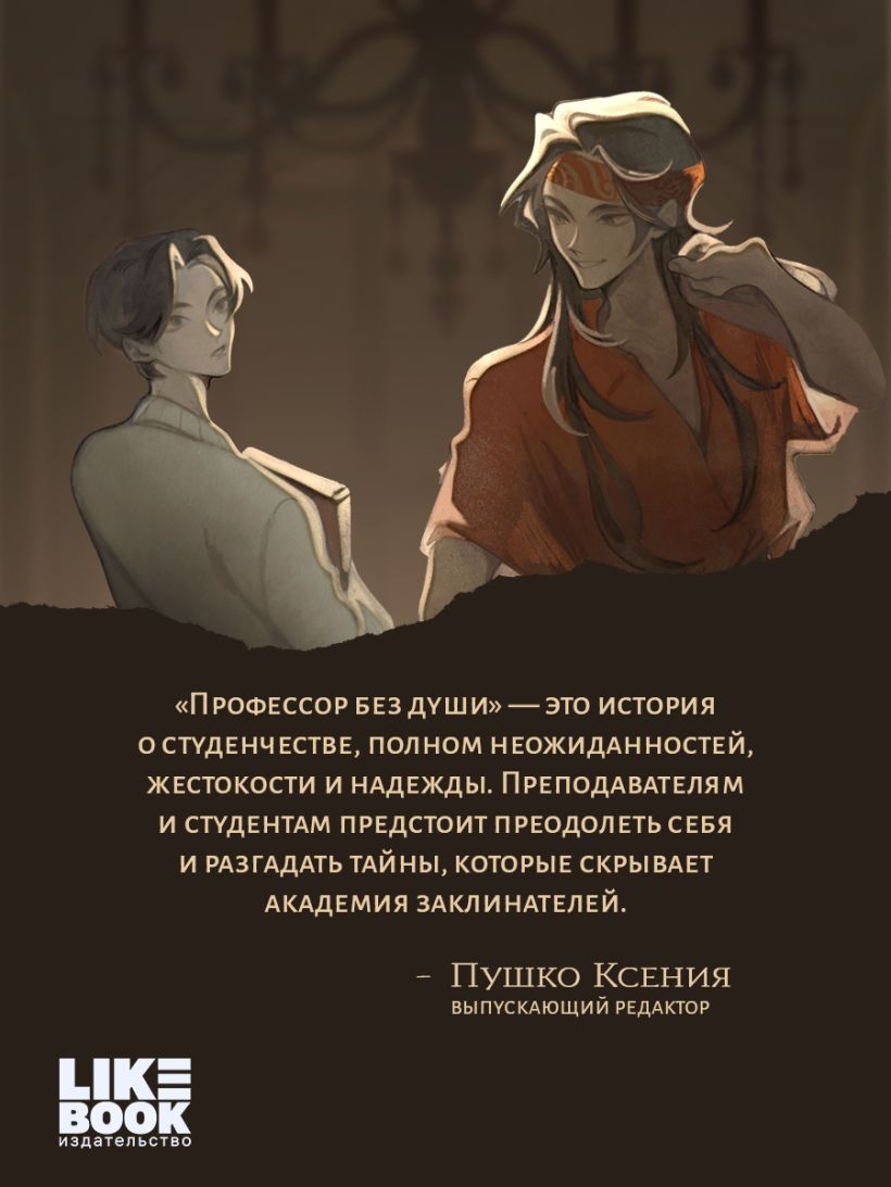 «Профессор без души» — история о дружбе, борьбе с судьбой и силе, которая рождается в доверии. Первокурсник с тяжелым прошлым, восстановившийся студент, утративший свои способности, преподаватель, потерявший тело, — их пути пересекутся в университете заклинателей. В коридорах общежития и аудиториях сплетутся судьбы студентов, скрывающих свои шрамы, и преподавателей, прячущих собственные тайны.