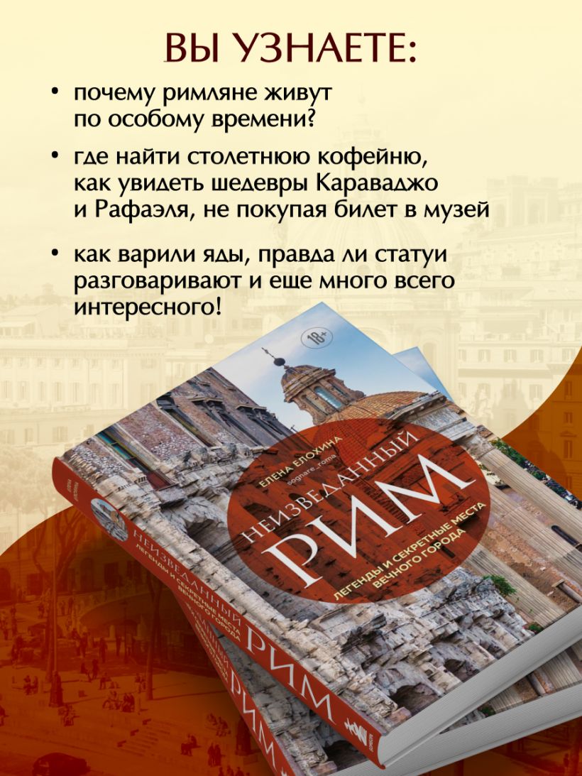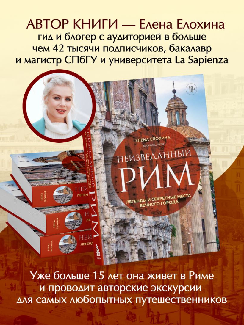 Елена Елохина — «римлянка в душе» — родом из Санкт-Петербурга, бакалавр и магистр СПбГУ и университета La Sapienza, профессиональный гид в Риме и Ватикане. Живет в Вечном городе более 15 лет и отлично знает местную культуру и язык. Она ведет популярный блог о Риме, где рассказывает о неизвестных местах города. Книга написана на основе ее опыта и экскурсий, которые она проводит для индивидуальных путешественников.