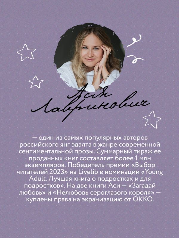 Ася Лавринович — один из самых популярных авторов российского янг эдалта в жанре современной сентиментальной прозы. Суммарный тираж ее проданных книг составляет более 1 млн экземпляров. Победитель премии «Выбор читателей 2023» на Livelib в номинации «Young Adult. Лучшая книга о подростках и для подростков». На две книги Аси — «Загадай любовь» и «Нелюбовь сероглазого короля» — куплены права на экранизацию от ОККО.